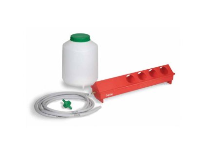 Napájačka – sada – GAUN 11660. Napájačka pre sliepky a inú hydinu – 8 otvorov, s ventilom, 10 m hadica s priemerom 9 mm, filter a nádrž na 8 litrov vody.