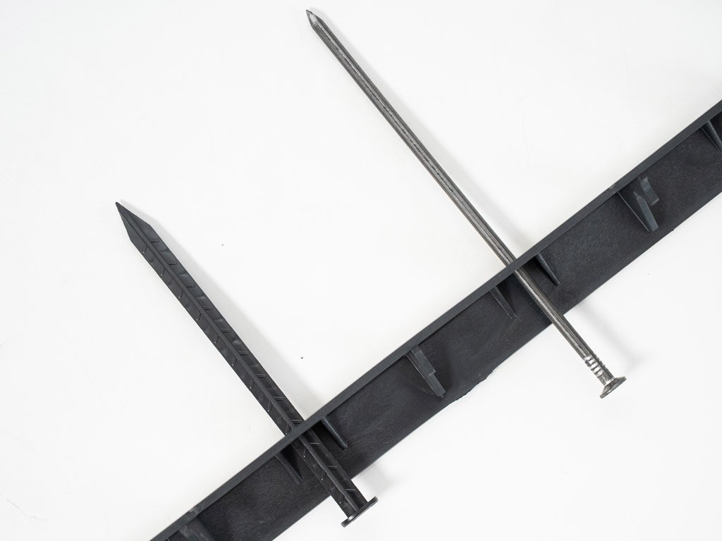 Pri usadzovaní rovného dielu plastového obrubníka vám postačia na 1 meter 3 kotviace klince. Pokiaľ však obrubník ohýbate a tvarujete, je vhodné diel ukotviť 6 kotviacimi klincami. Na jednom diely obrubníka LEGI dĺžky 1 meter je vždy 6 otvorov na klince. Do týchto otvorov pasujú oba typy uvedených klincov. Na zatlčenie klincov postačí obyčajné kladivo.