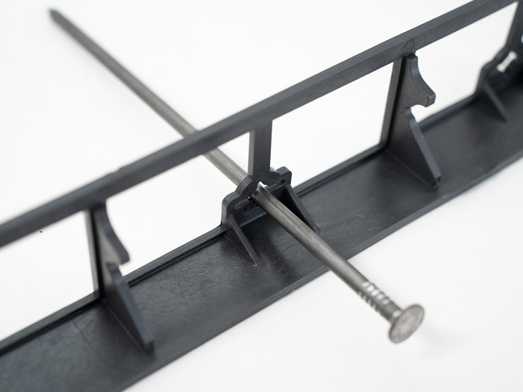 Pri usadzovaní rovného dielu plastového obrubníka vám postačia na 1 meter 3 kotviace klince. Pokiaľ však obrubník ohýbate a tvarujete, je vhodné diel ukotviť 6 kotviacimi klincami. Na jednom diely obrubníka LEGI dĺžky 1 meter je vždy 6 otvorov na klince. Do týchto otvorov pasujú oba typy uvedených klincov. Na zatlčenie klincov postačí obyčajné kladivo.