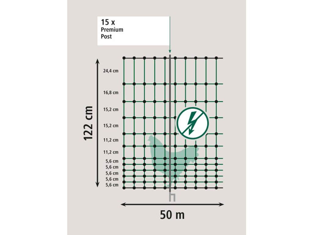 Ohradníková nevodivá sieť pre hydinu PREMIUM s výškou 122 cm a dĺžkou 50 m. Balenie obsahuje 15 mimoriadne odolných stĺpikov s dvojitým pozinkovaným hrotom, ktoré zabezpečujú vysokú stabilitu výbehu. Vďaka mimoriadne malej veľkosti ôk v spodnej časti je sieť vhodná pre kuriatka alebo jahniatka.
