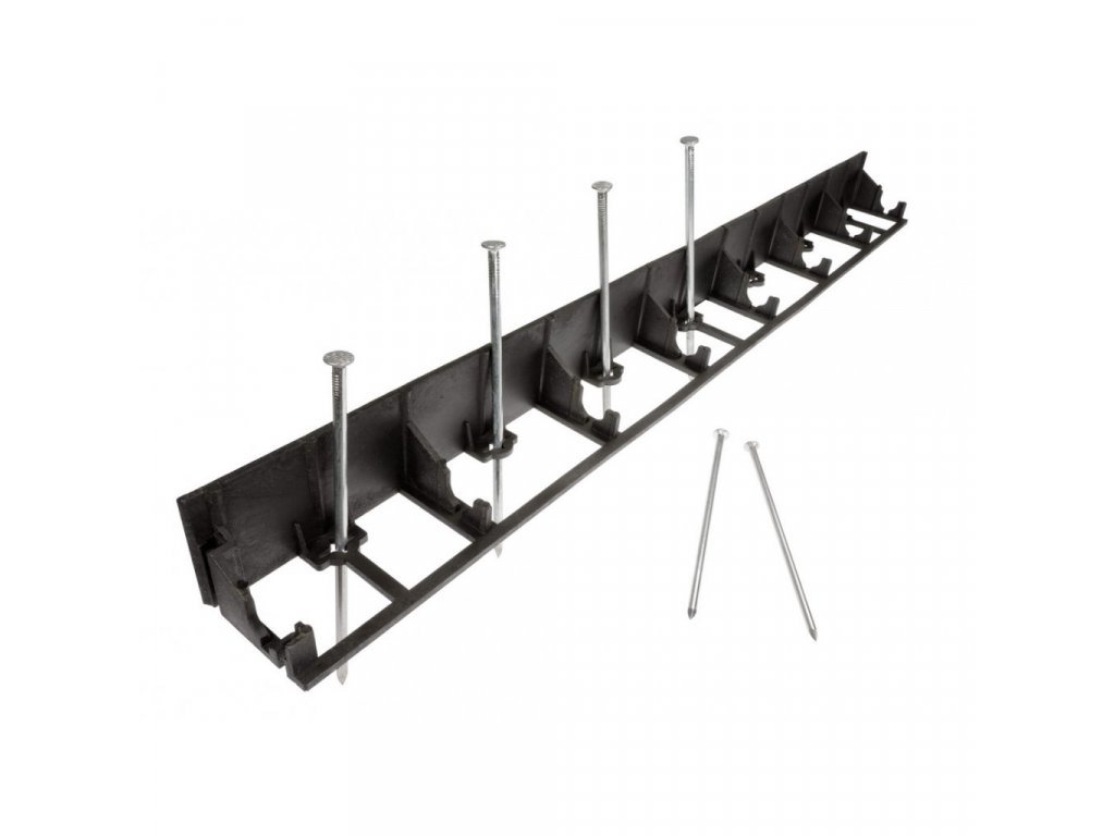 Pri usadzovaní rovného dielu plastového obrubníka vám postačia na 1 meter 3 kotviace klince. Pokiaľ však obrubník ohýbate a tvarujete, je vhodné diel ukotviť 6 kotviacimi klincami. Na jednom diely obrubníka IGEL dĺžky 1 meter je vždy 6 otvorov na klince. Do týchto otvorov pasujú oba typy uvedených klincov. Na zatlčenie klincov postačí obyčajné kladivo.