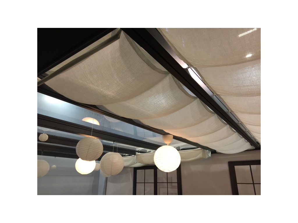 Praktická krémovo biela viacdielna zatvárateľná zástena pre pergolu Torino 3 x 5,46 / Sierra 3 x 5,46, ktorá sa ľahko inštaluje do drážok profilov pod strechu. V prípade slnečného počasia účinne chráni pred prílišným prehriatím interiéru.