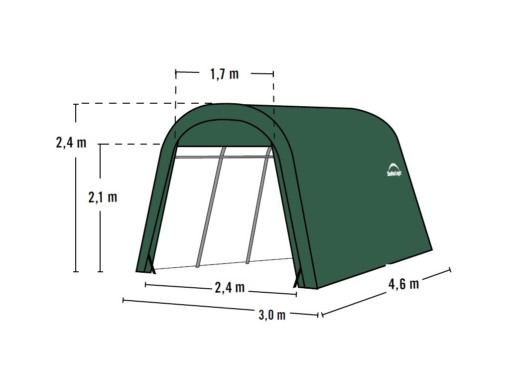 Veľmi kvalitná a pevná plachtová garáž SHELTERLOGIC 3 x 4,6 m vytvorí rýchle, kryté garážové státie pre Váš automobil. Môže byť riešením pre uskladnenie sena, slamy a krmiva pre hospodárske zvieratá. Alebo ju je možné využiť k sezónnemu uskladneniu záhradkárskych, športových a motoristických potrieb či k uskladneniu dreva. Plachtová garáž je široká 300 cm (predná strana so vstupným otvorom) a 460 cm dlhá. Zastavaná plocha činí 13,8 m2.