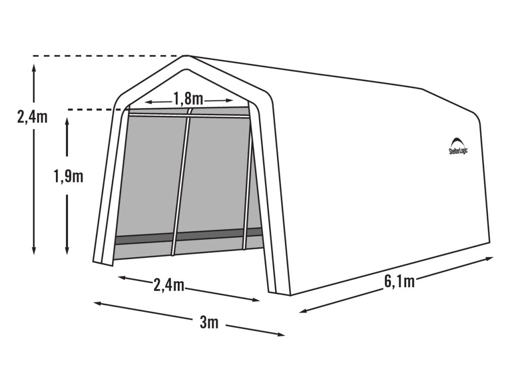 Veľmi kvalitná a pevná plachtová garáž SHELTERLOGIC 3 x 6,1 m vytvorí rýchle, kryté garážové státie pre Váš automobil. Môže byť riešením pre uskladnenie sena, slamy a krmiva pre hospodárske zvieratá. Alebo ju je možné využiť k sezónnemu uskladneniu záhradkárskych, športových a motoristických potrieb či k uskladneniu dreva. Plachtová garáž je široká 300 cm (predná strana so vstupným otvorom) a 610 cm dlhá. Zastavaná plocha činí 18,3 m2.