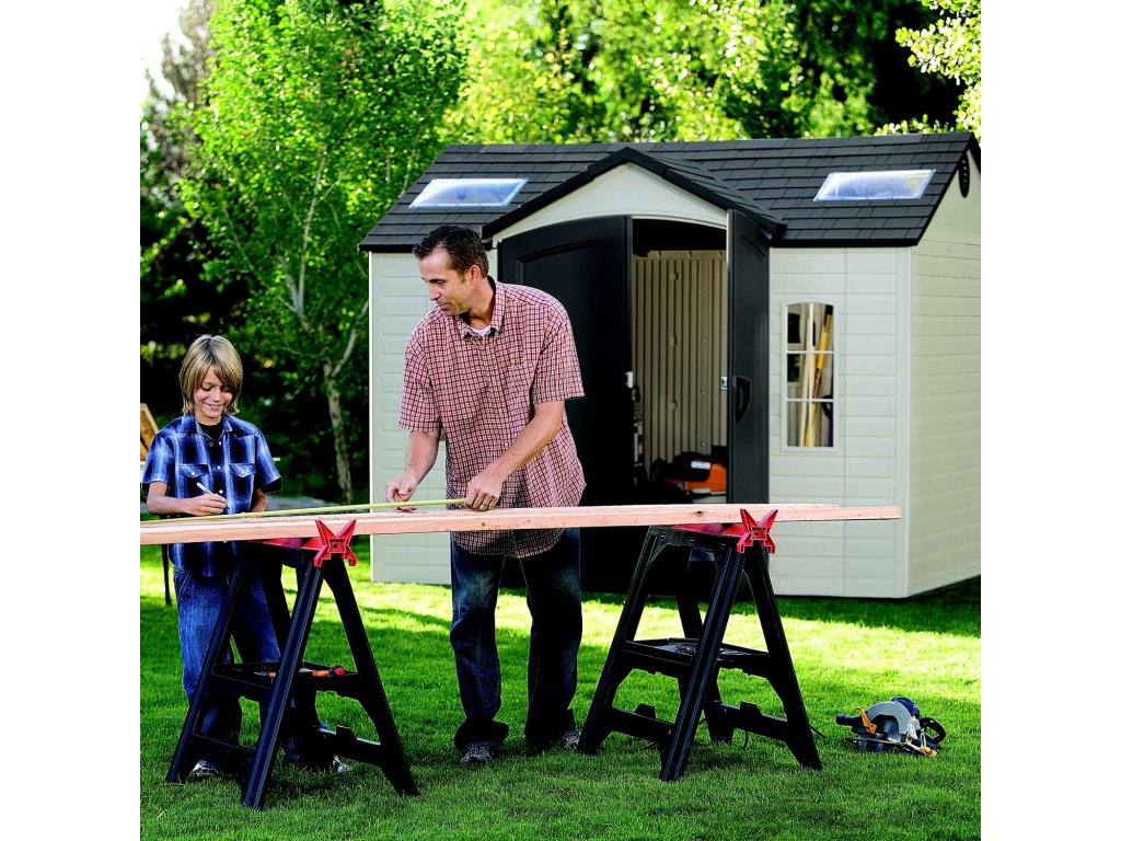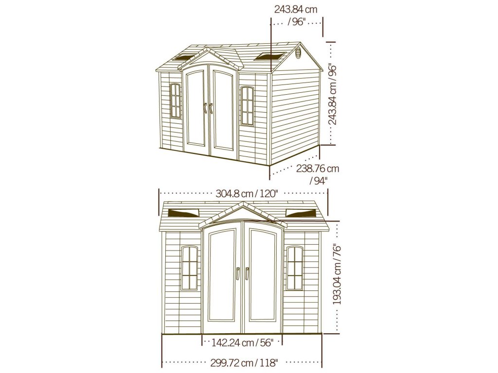 Záhradný domček na náradie Lifetime SKY vo farebnej kombinácii svetlá/tmavá sivá sa hodí k celoročnému uskladneniu náradia, kosačiek, nábytku a ďalšieho záhradného vybavenia. Domček má rozmery 305 x 244 cm (predná strana s dvermi x hĺbka) a celkovú výšku 2,4 m. Zastavaná plocha činí 7,4 m2.