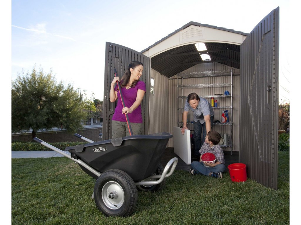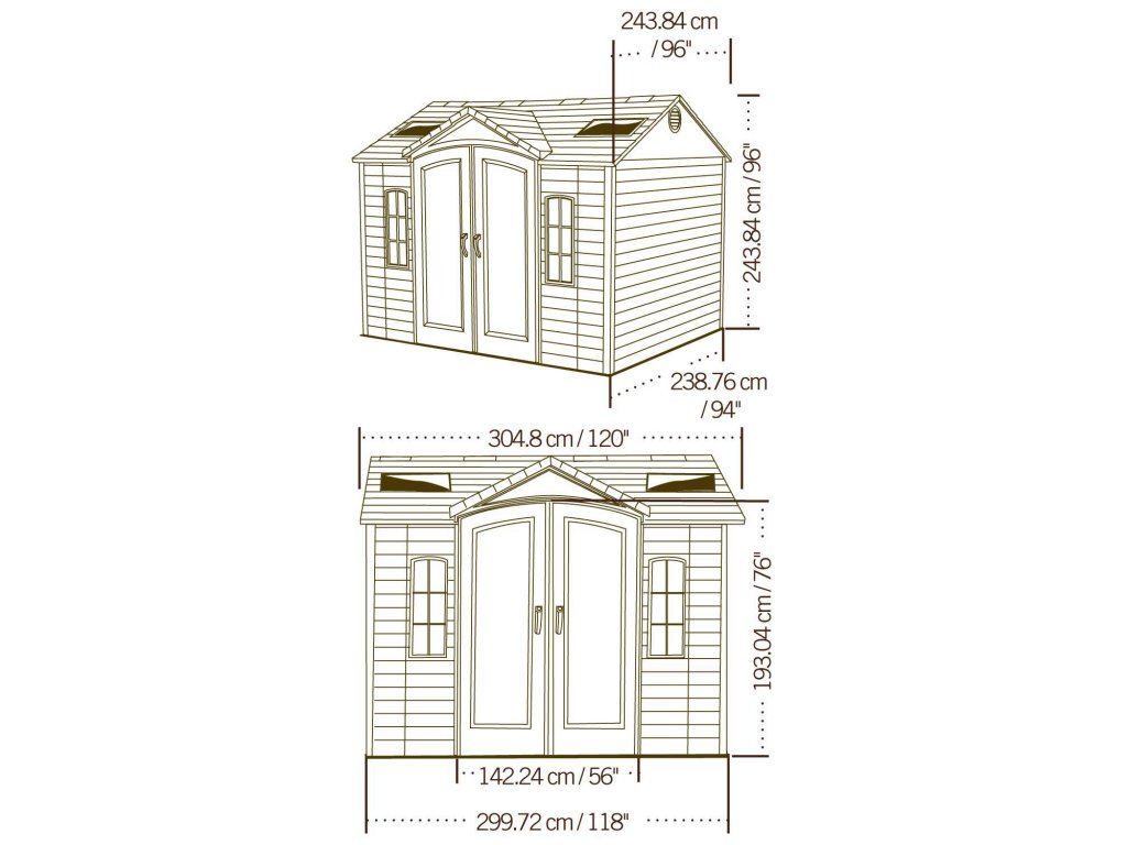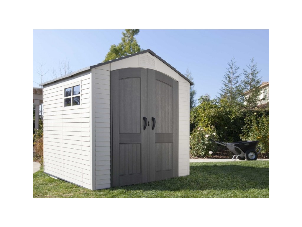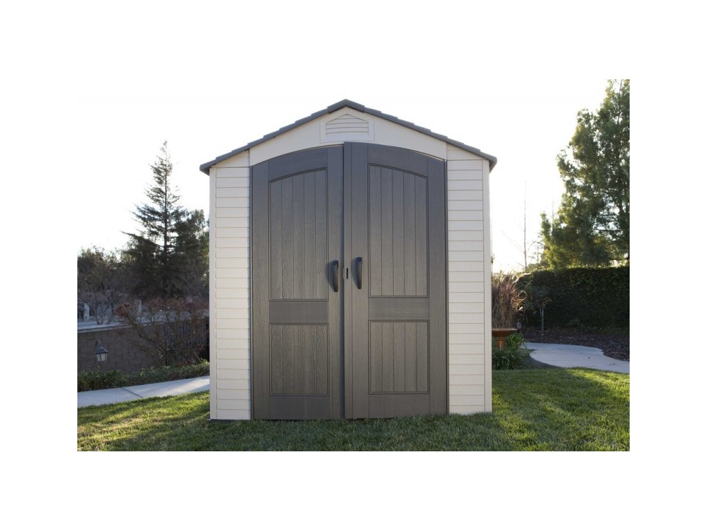 Záhradný domček na náradie LIFETIME FOX vo farebnej kombinácii svetlá/tmavá sivá sa hodí k celoročnému uskladneniu náradia, kosačiek, nábytku a ďalšieho záhradného vybavenia. Domček má rozmery 215 x 214 cm (predná strana s dvermi x hĺbka) a celkovú výšku 2,3 m. Zastavaná plocha činí 4,6 m2.