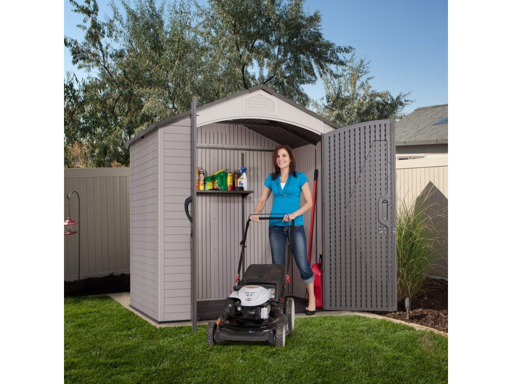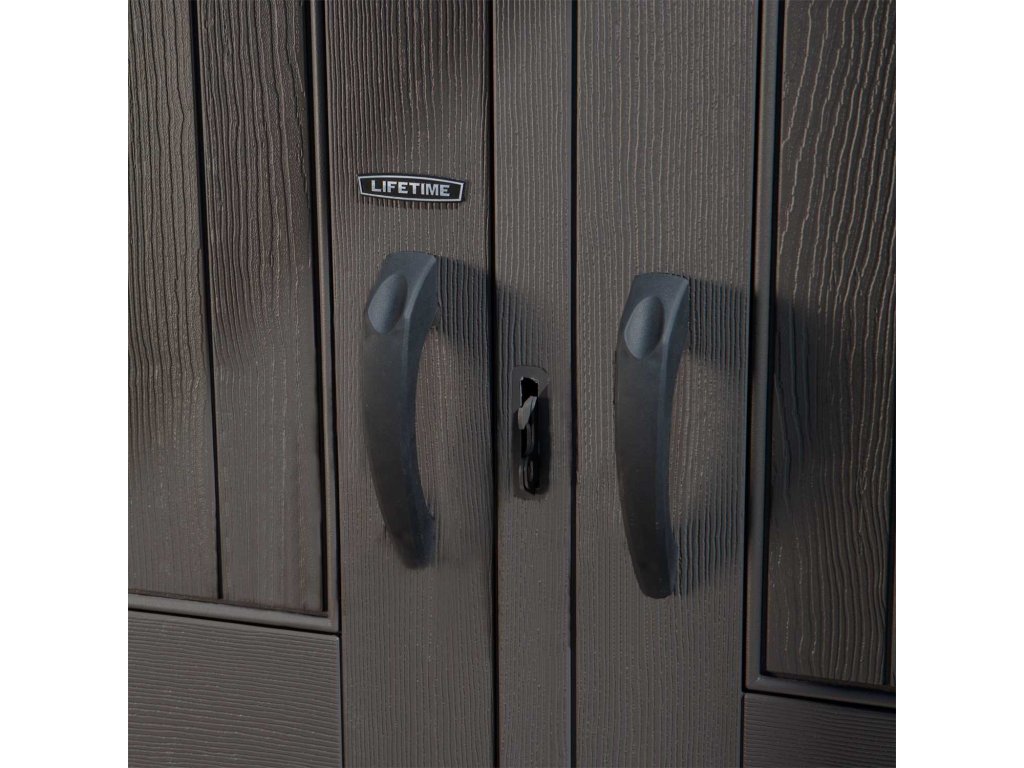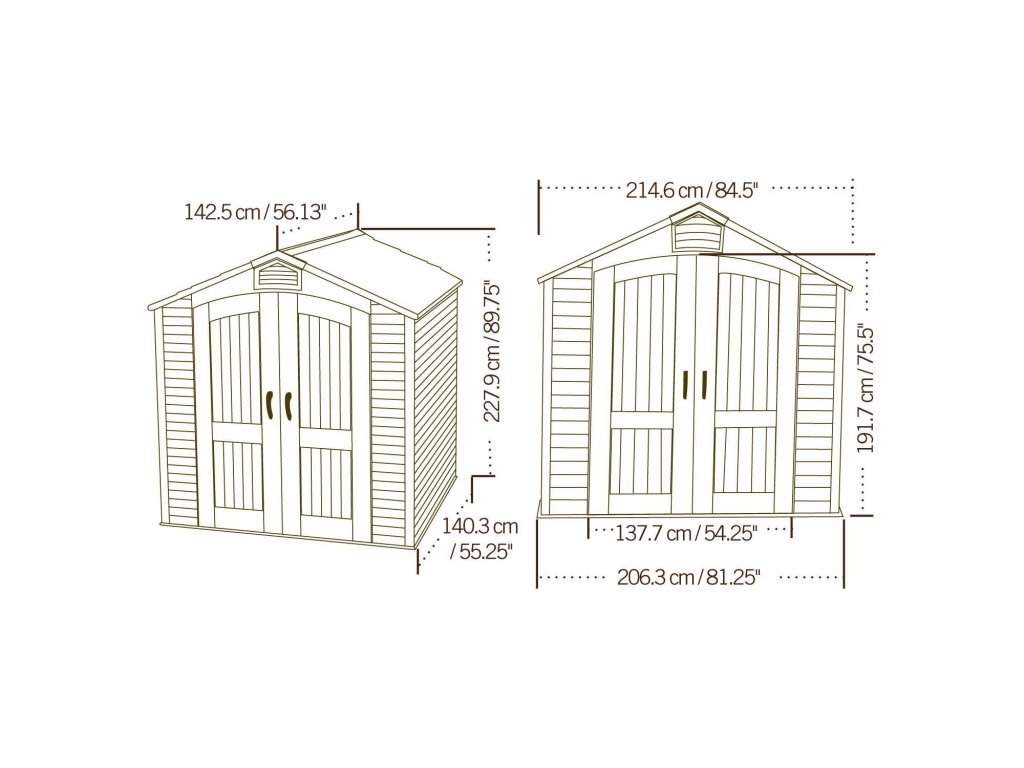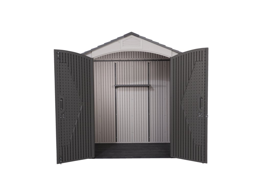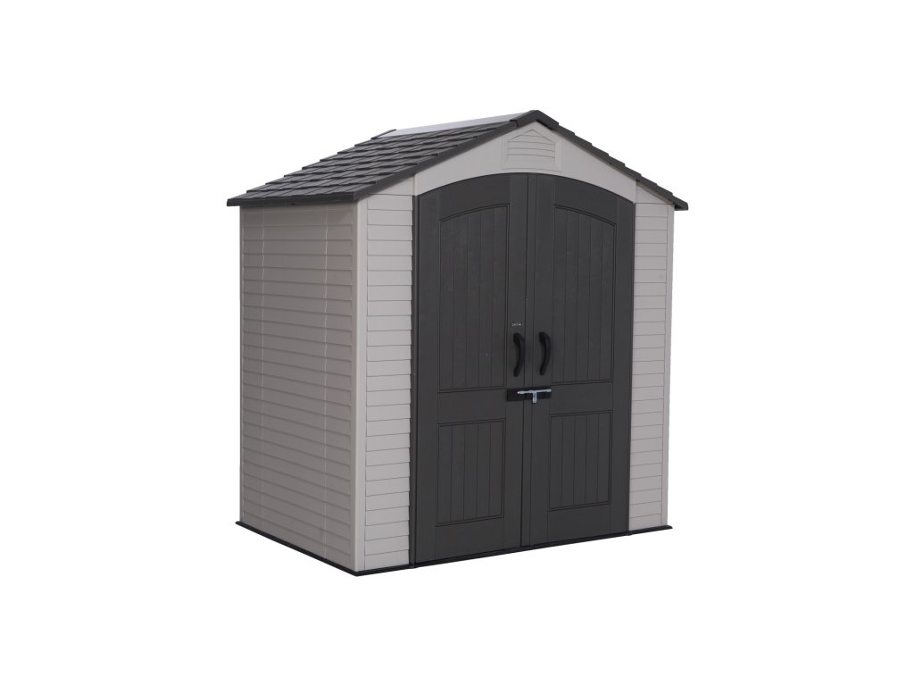 Záhradný domček na náradie LIFETIME STARLET vo farebnej kombinácii svetlá/tmavá sivá sa hodí k celoročnému uskladneniu náradia, kosačiek, nábytku a ďalšieho záhradného vybavenia. Domček má rozmery 215 x 143 cm (predná strana s dvermi x hĺbka) a celkovú výšku 2,3 m. Zastavaná plocha činí 3,1 m2.
