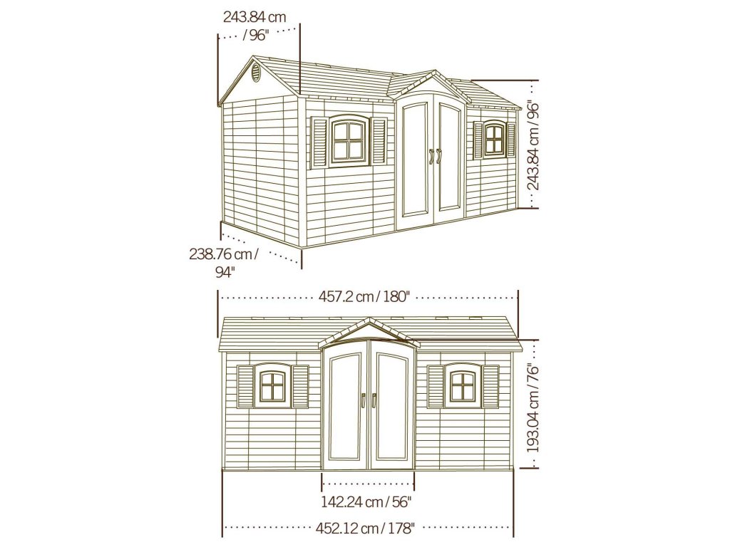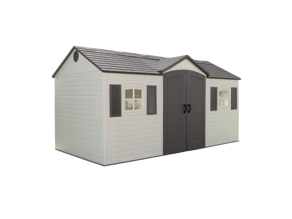 Záhradný domček na náradie LIFETIME GARTEN VILLA vo farebnej kombinácii svetlá/tmavá sivá sa hodí k celoročnému uskladneniu náradia, kosačiek, nábytku a ďalšieho záhradného vybavenia. Domček má rozmery 457 x 244 cm (predná strana s dvermi x hĺbka) a celkovú výšku 2,4 m. Zastavaná plocha činí 11,2 m2.