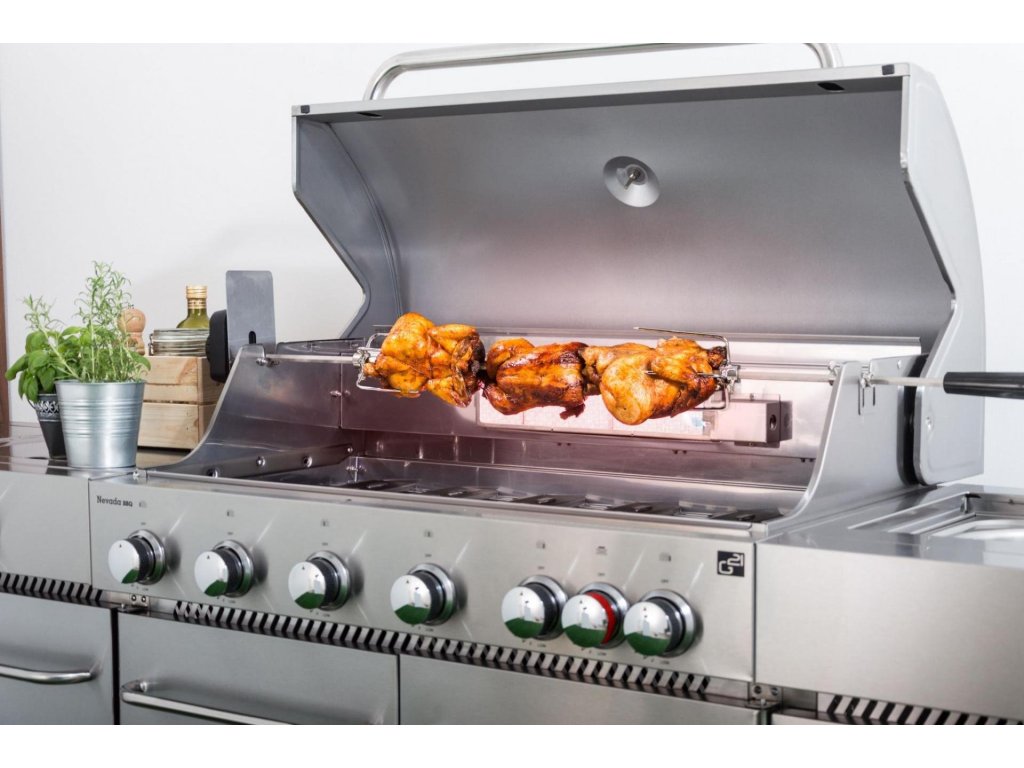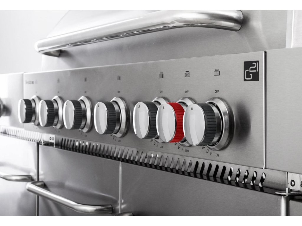 Plynový gril G21 Nevada BBQ je nepostrádateľným spoločníkom pre vaše grilovanie s rodinou či priateľmi. Robustná konštrukcia grilu je z vysoko akostnej nerezovej ocele. Gril disponuje šiestimi hlavnými horákmi. Jeden je keramický Infra Red, ktorý okamžite dokáže zvýšiť teplotu na 250 - 300°C, môžete ho tak využiť na varenie aj grilovanie. Keramický horák je tiež vhodný na grilovanie na grilovacej ihle, môžete tak ugrilovať celé kura. Posledný horák je umiestnený na bočnej strane grilu. Bočný horák môžete využiť aj ako varič.
