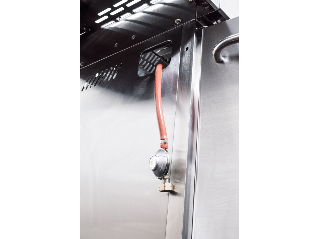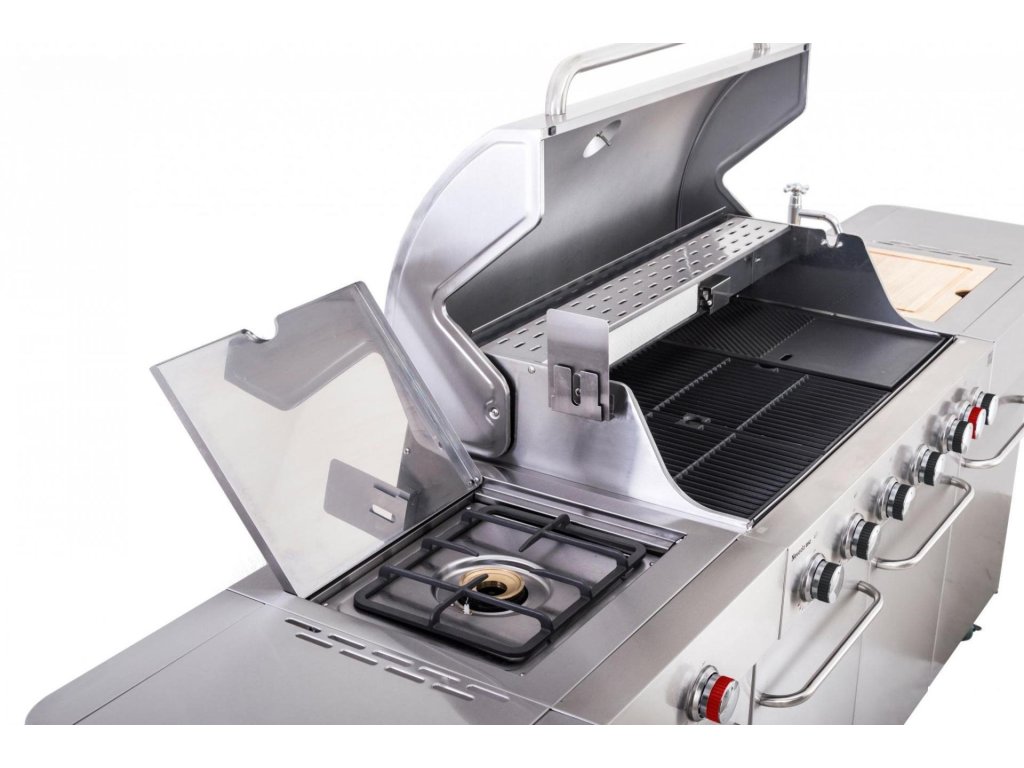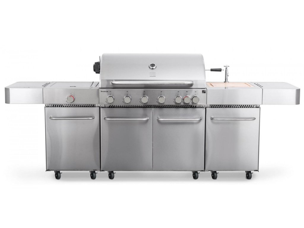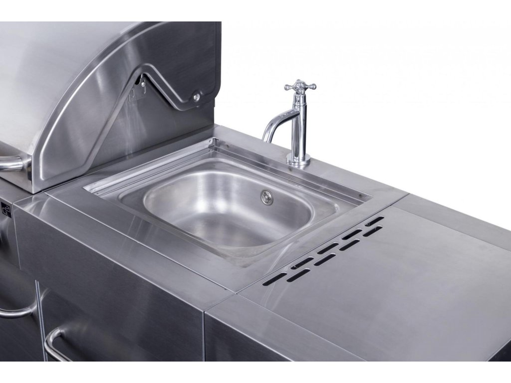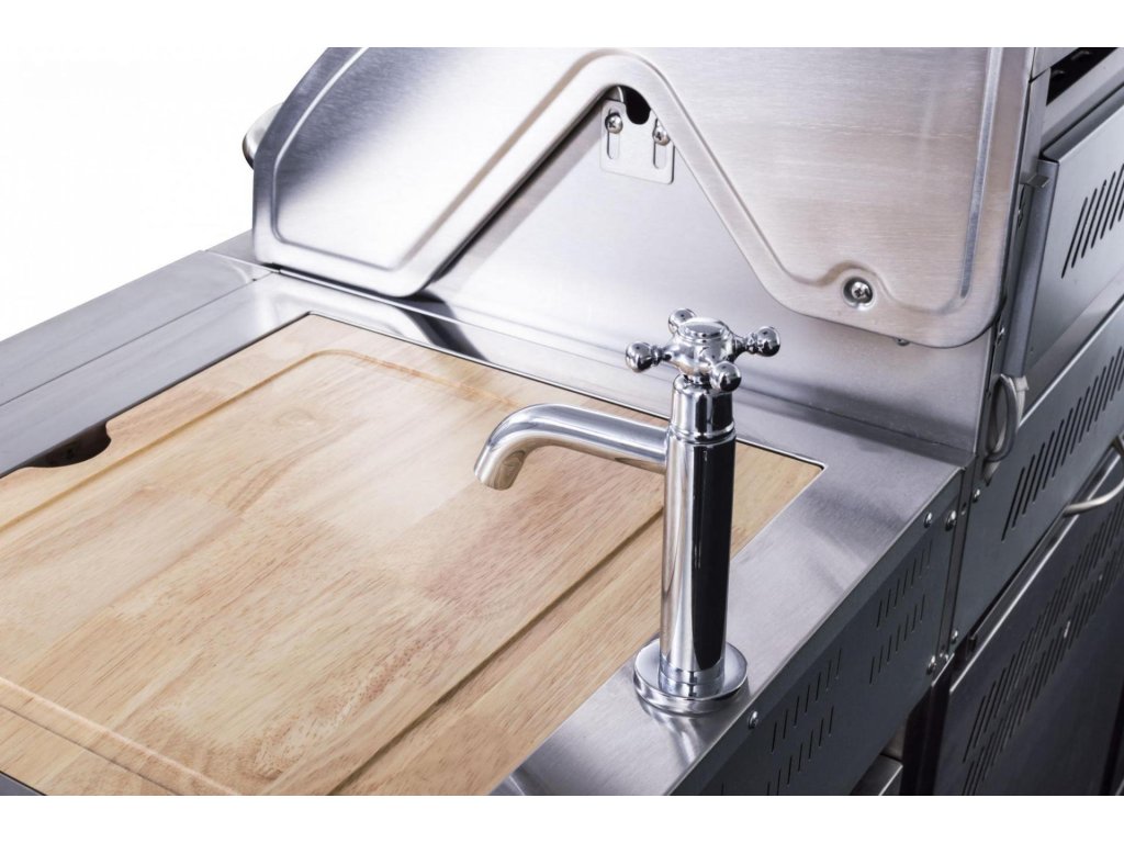 Gril navyše disponuje vstavaným drezom, ktorý má prívod na vodu zo záhradnej hadice. Až riad opláchnete jednoducho stačí drez zakryť doskou a získate tak väčšiu pracovnú plochu na prípravu pokrmov. Grilovacie náčinie prípadne aj plynovú bombu môžete pohodlne uložiť do vstavaných priehradiek umiestnených pod horákmi a drezom. Priehradky sú opatrené dvierkami, takže uložené veci sú chránené pred prachom aj počasím.