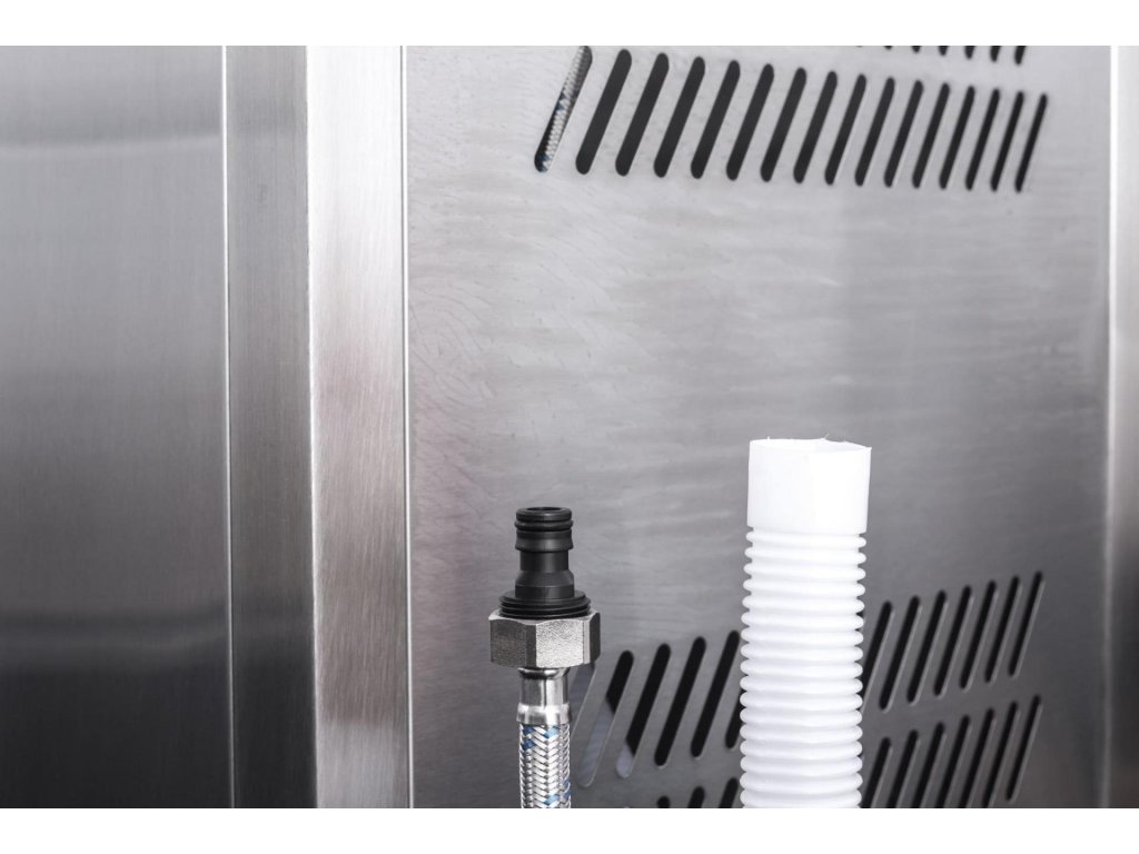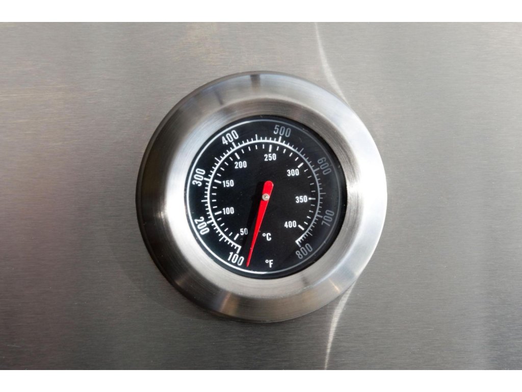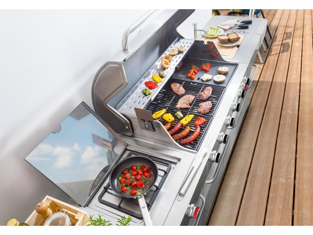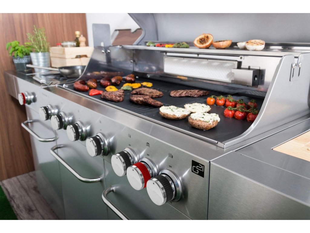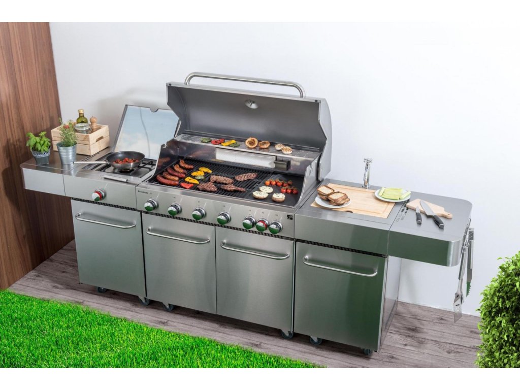 Gril navyše disponuje vstavaným drezom, ktorý má prívod na vodu zo záhradnej hadice. Až riad opláchnete jednoducho stačí drez zakryť doskou a získate tak väčšiu pracovnú plochu na prípravu pokrmov. Grilovacie náčinie prípadne aj plynovú bombu môžete pohodlne uložiť do vstavaných priehradiek umiestnených pod horákmi a drezom. Priehradky sú opatrené dvierkami, takže uložené veci sú chránené pred prachom aj počasím.