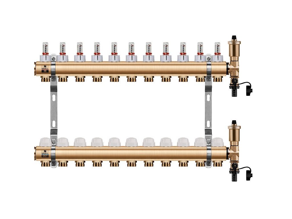 Podlahový rozdeľovač WIGELL, 11 okruhov, mosadzný + odvzdušňovanie na kľúč