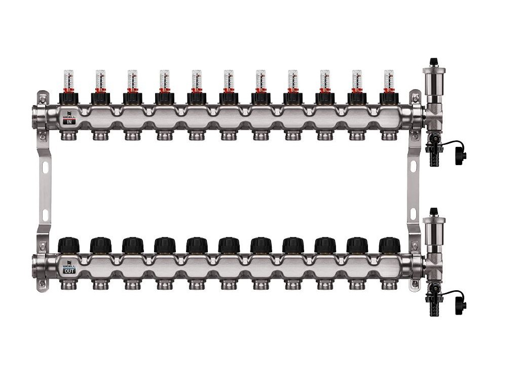 Podlahový rozdeľovač WIGELL, 11 okruhov, nerez + automatické odvzdušňovanie