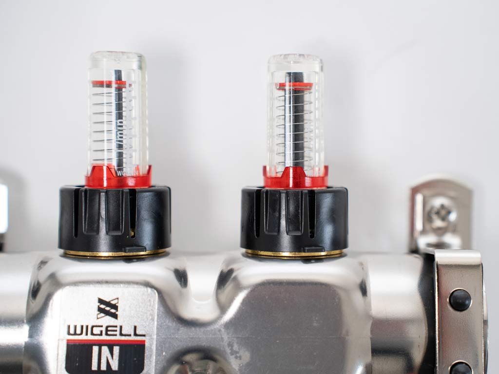 - Rozdeľovač je osadený regulačnými ventilmi, prietokomermi a odvzdušňovačmi.