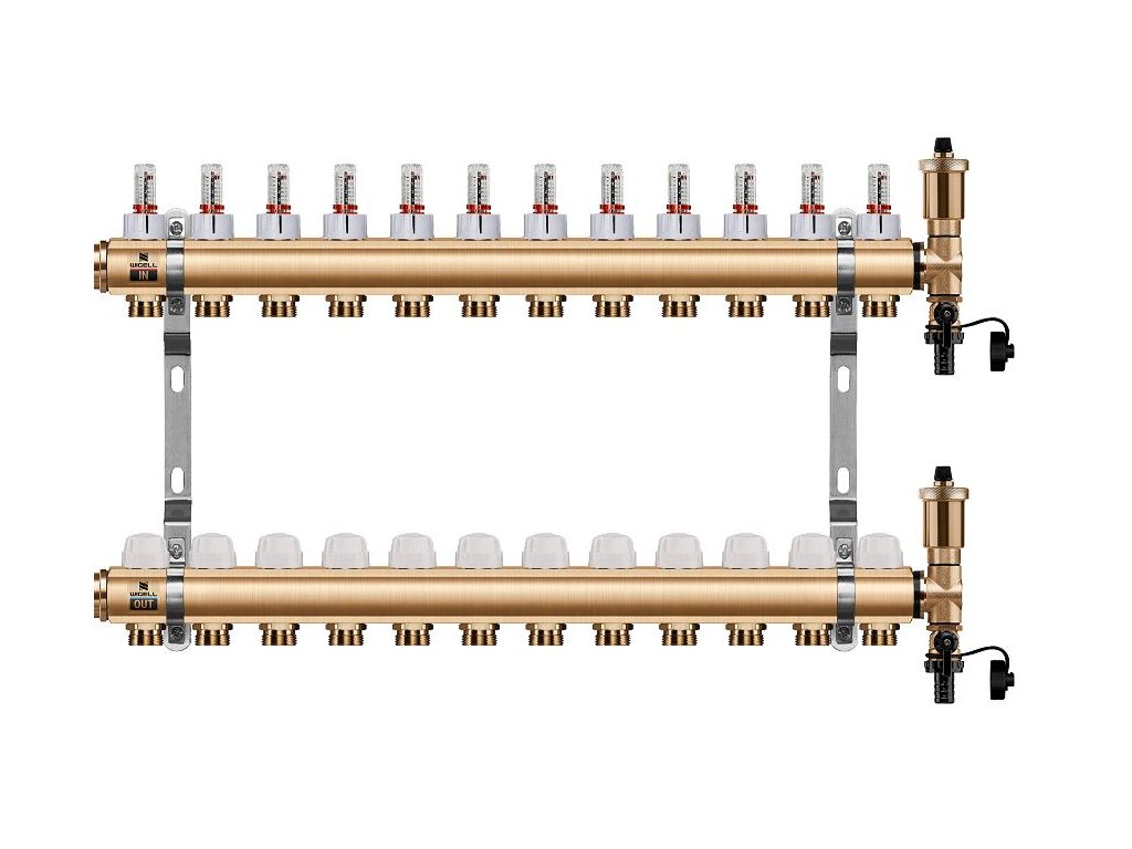 Podlahový rozdeľovač WIGELL, 12 okruhov, mosadzný + odvzdušňovanie na kľúč