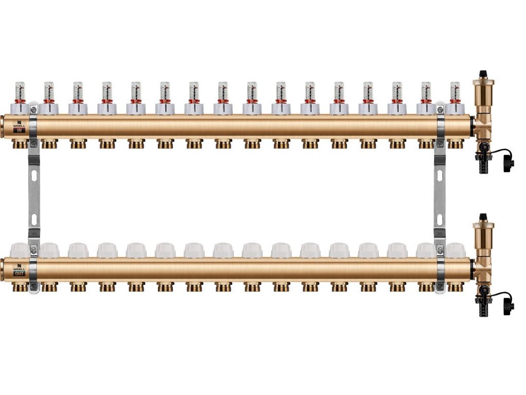 Podlahový rozdeľovač WIGELL, 16 okruhov, mosadzný + automatické odvzdušňovanie