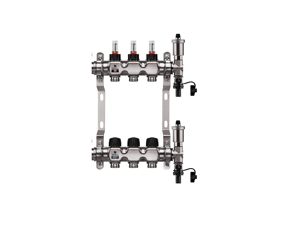 Podlahový rozdeľovač WIGELL, 3 okruhy, nerez + automatické odvzdušňovanie
