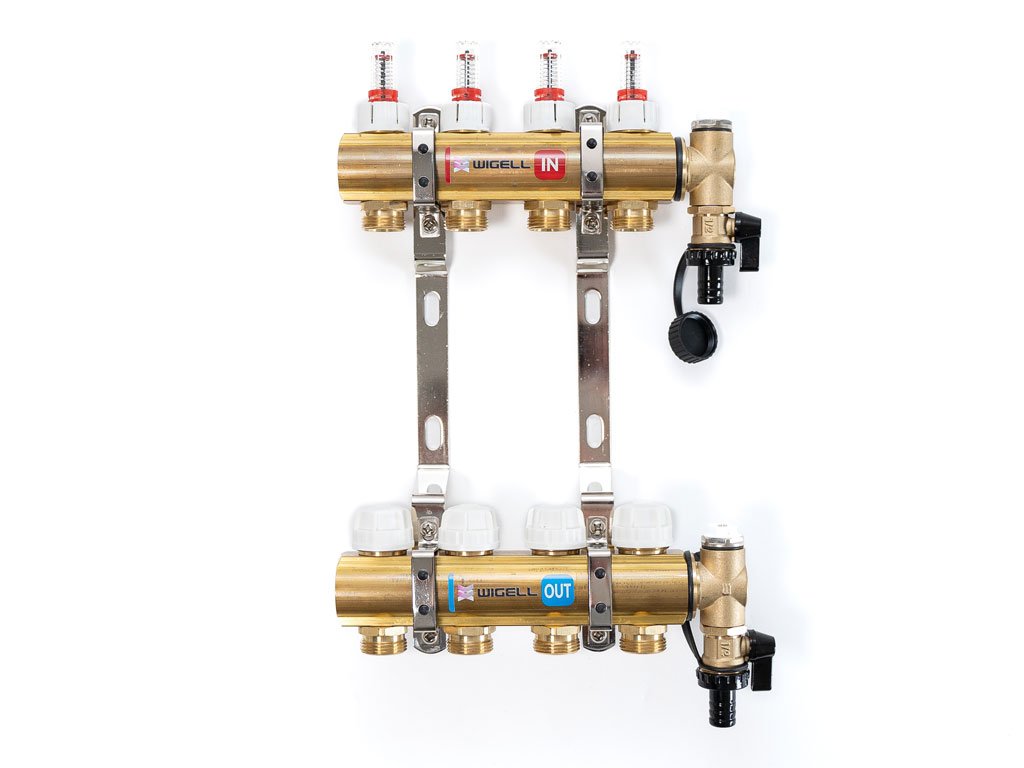 Podlahový rozdeľovač WIGELL, 4 okruhy, mosadzný + odvzdušňovanie na kľúč