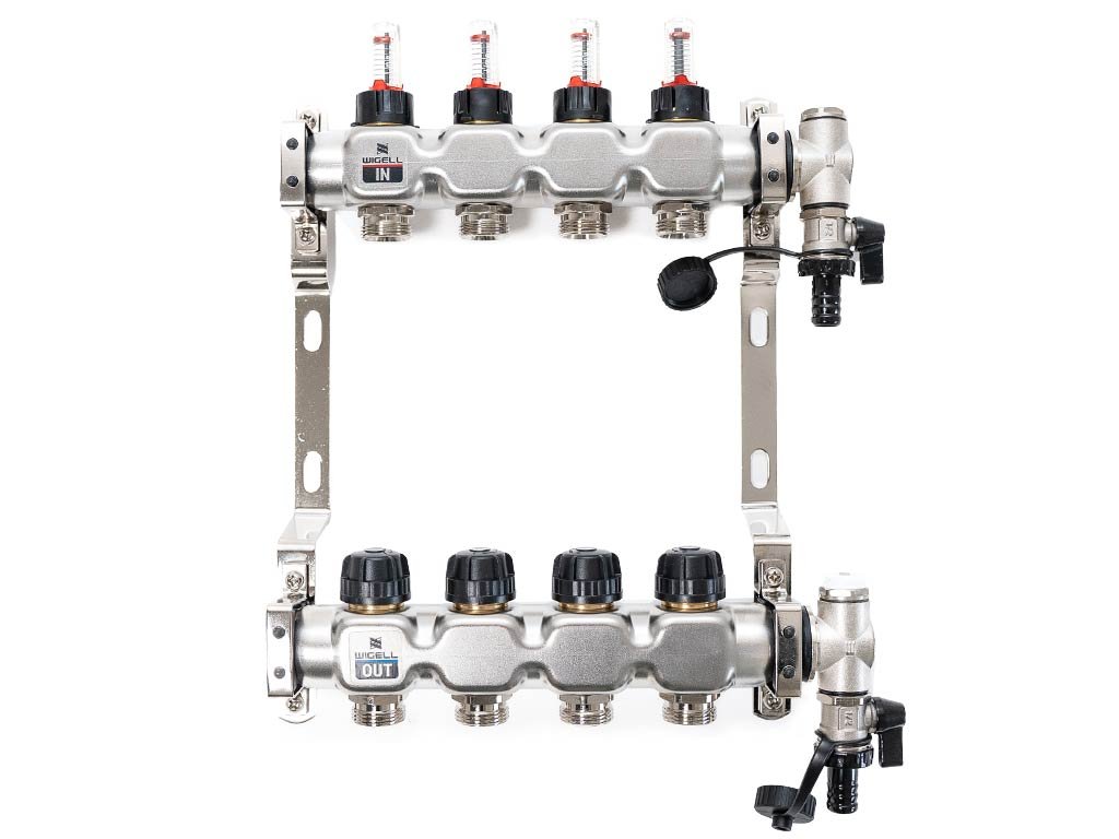Podlahový rozdeľovač WIGELL, 4 okruhy, nerez + odvzdušňovanie na kľúč