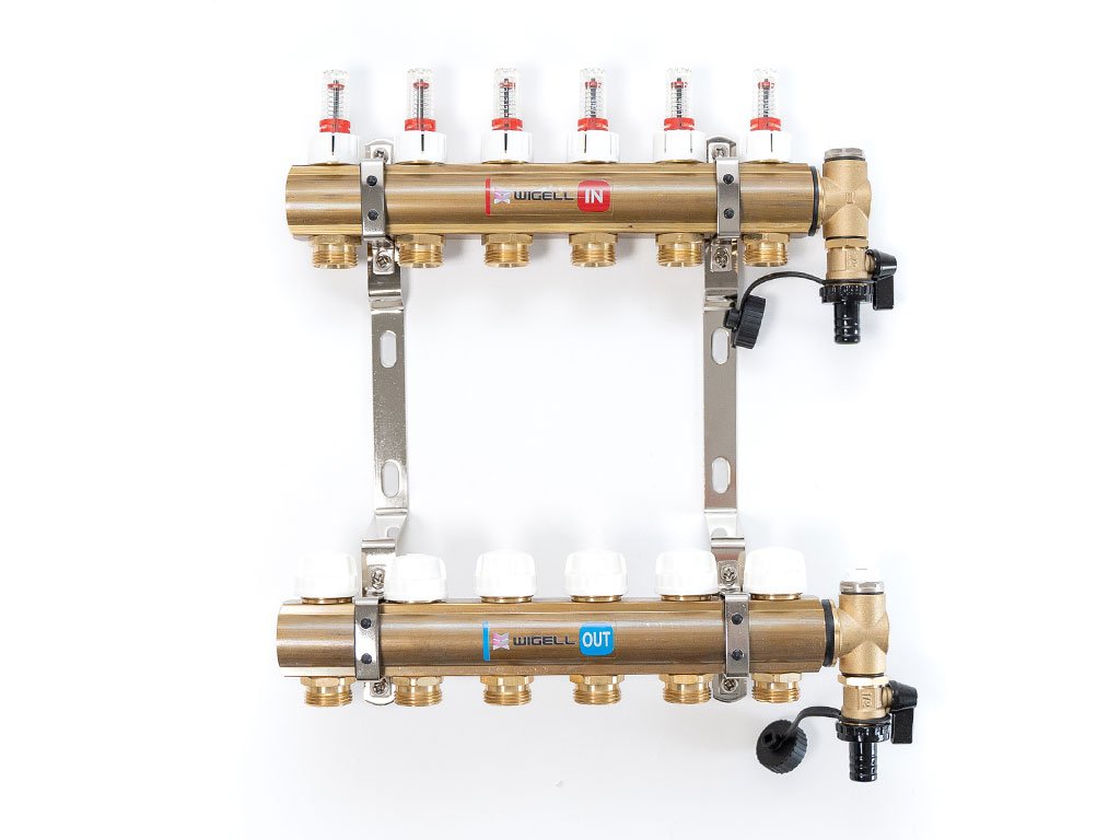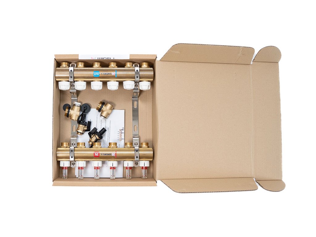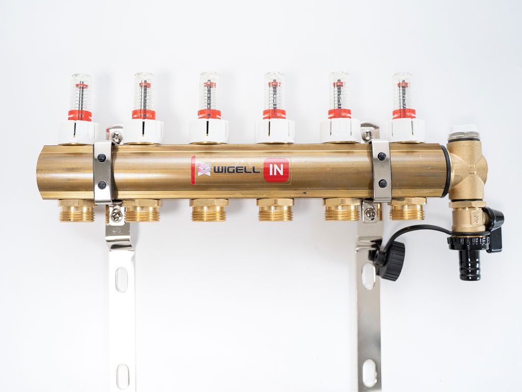 Podlahový rozdeľovač WIGELL, 6 okruhov, mosadzný + odvzdušňovanie na kľúč