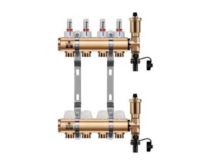 - Rozdeľovač je osadený regulačnými ventilmi, prietokomermi a odvzdušňovačmi.