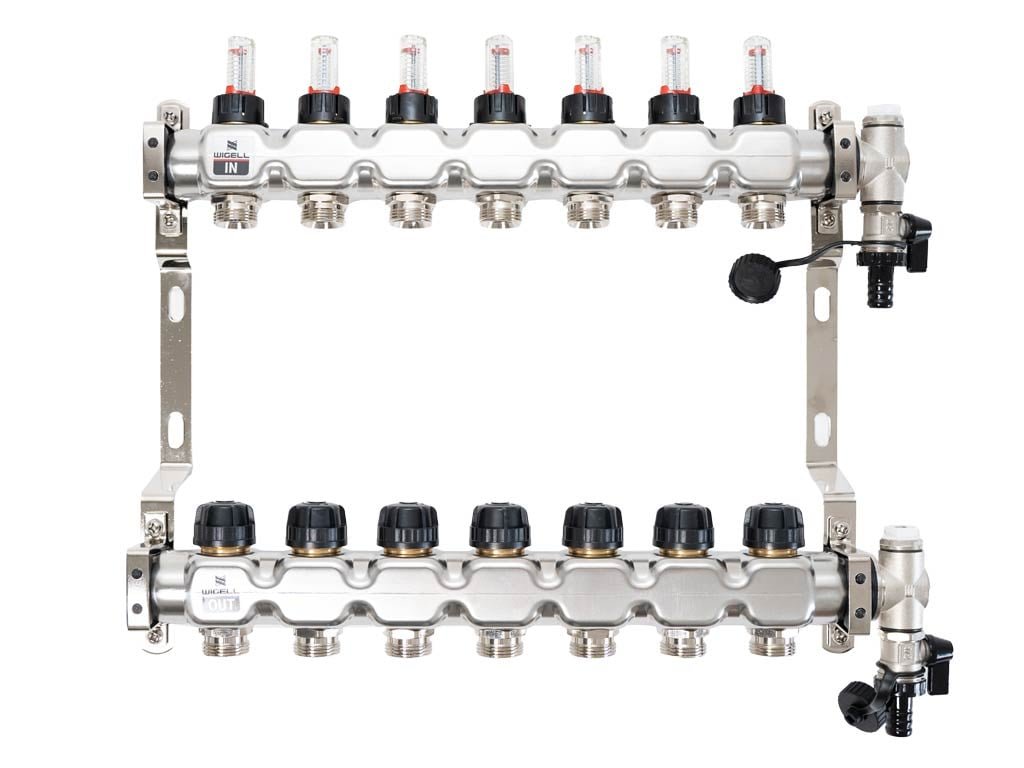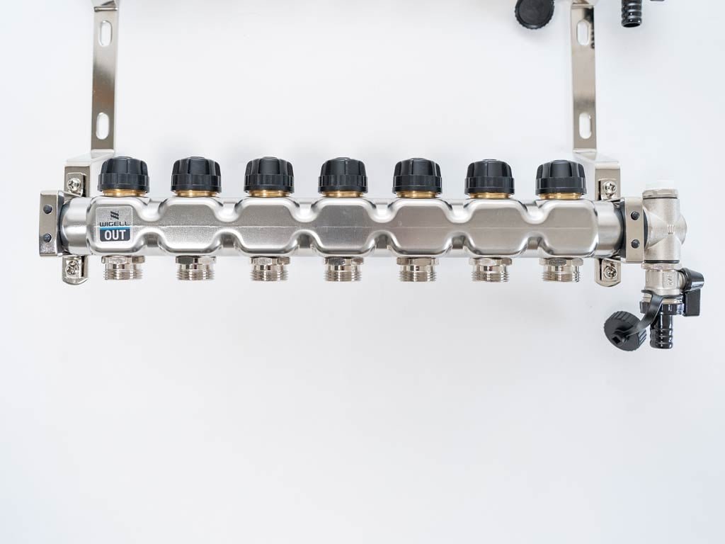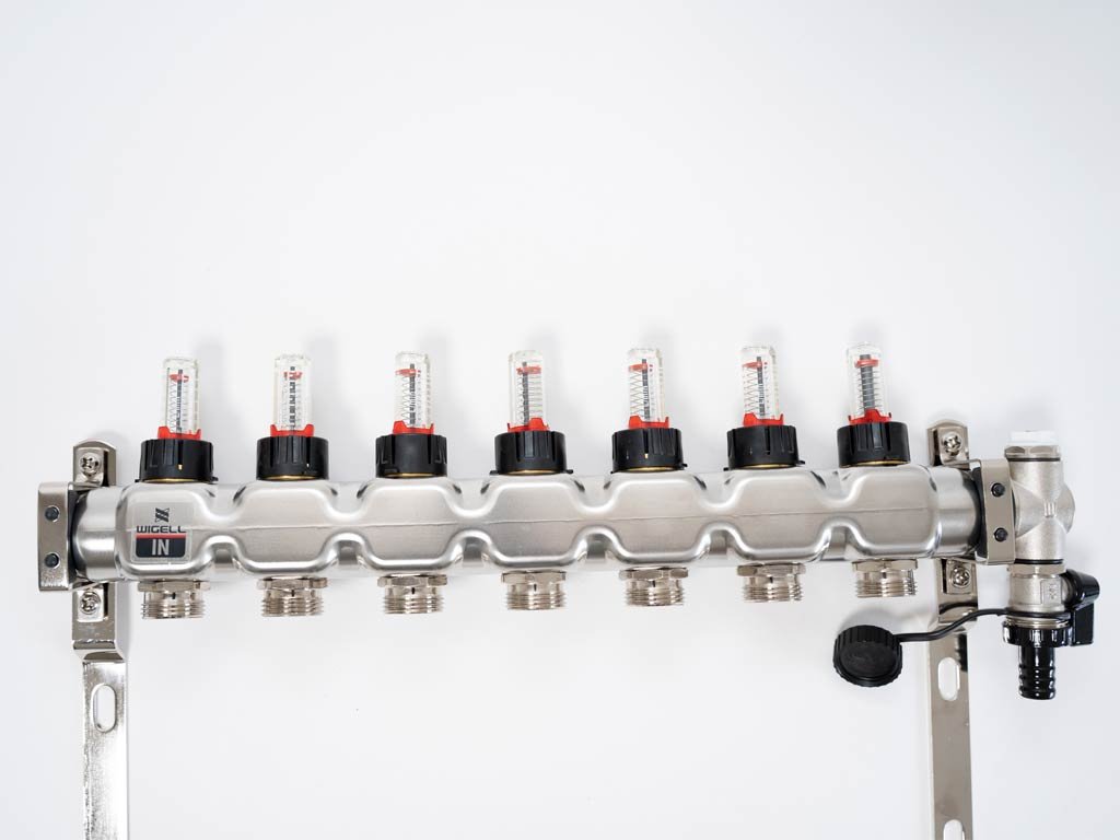 Podlahový rozdeľovač WIGELL, 7 okruhov, nerez + odvzdušňovanie na kľúč