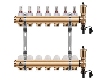- Rozdeľovač je osadený regulačnými ventilmi, prietokomermi a odvzdušňovačmi.