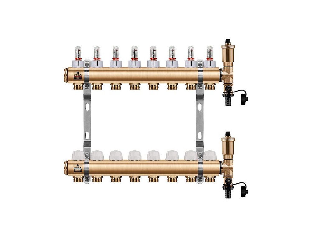 Podlahový rozdeľovač WIGELL, 8 okruhov, mosadzný + automatické odvzdušňovanie
