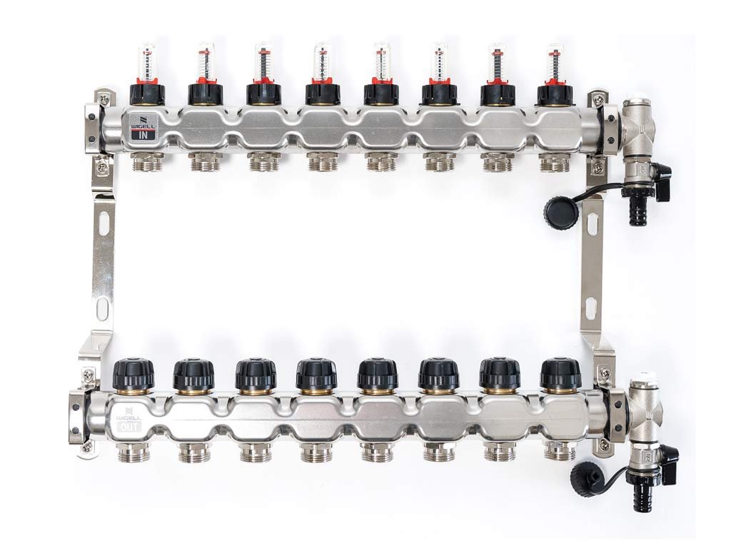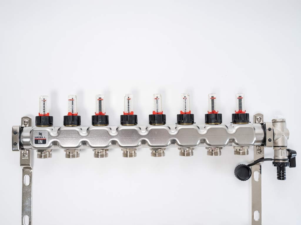 Podlahový rozdeľovač WIGELL, 8 okruhov, nerez + odvzdušňovanie na kľúč