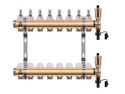 - Rozdeľovač je osadený regulačnými ventilmi, prietokomermi a odvzdušňovačmi.
