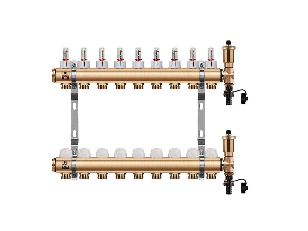 Podlahový rozdeľovač WIGELL, 9 okruhov, mosadzný + automatické odvzdušňovanie