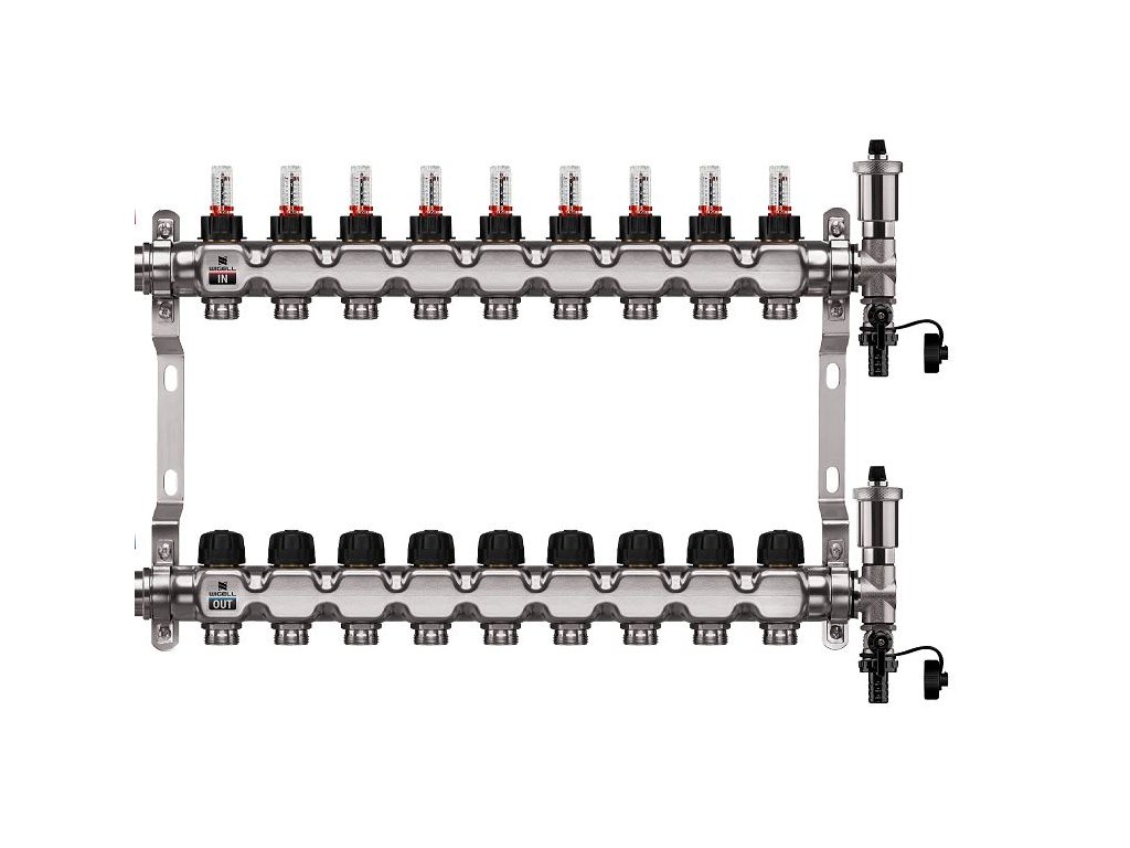 Podlahový rozdeľovač WIGELL, 9 okruhov, nerez + automatické odvzdušňovanie