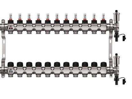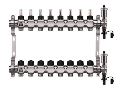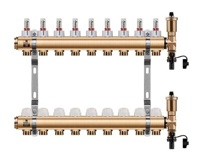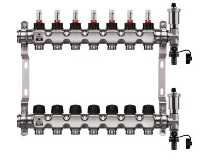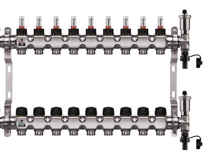- Rozdeľovač je osadený regulačnými ventilmi, prietokomermi a odvzdušňovačmi.