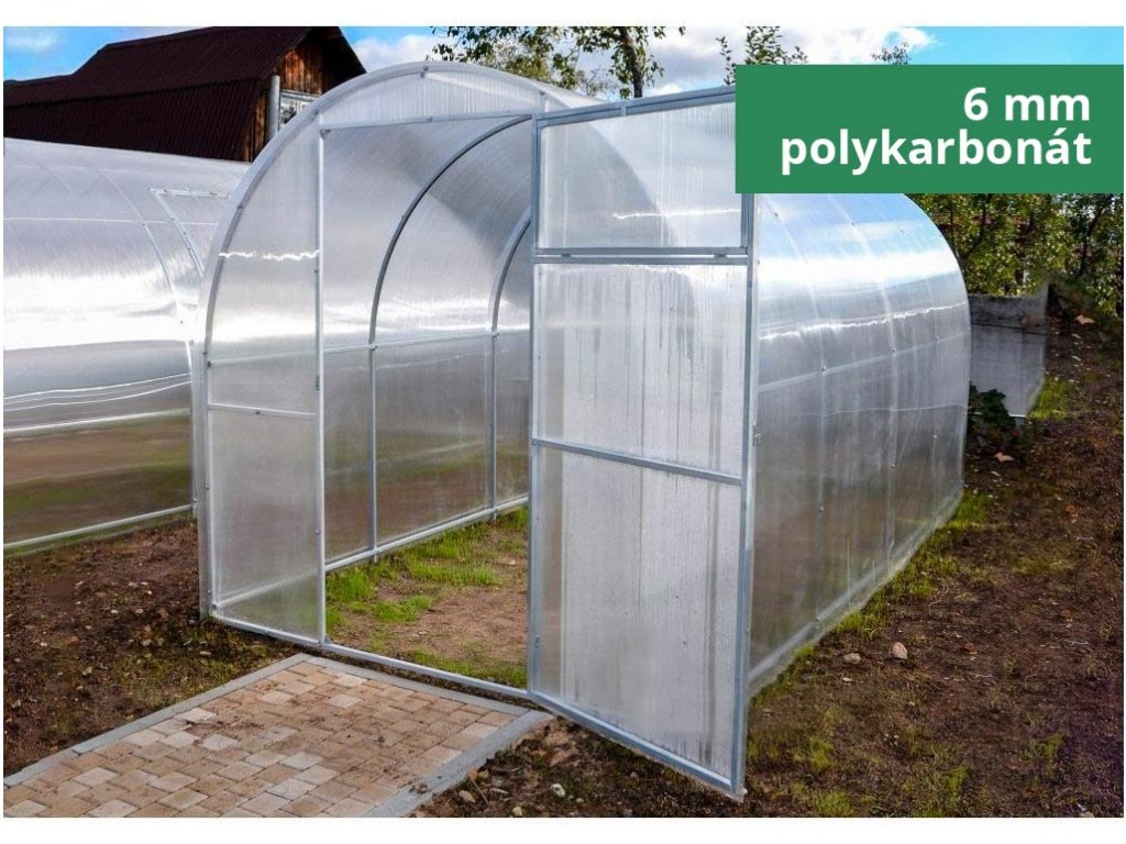 Zasklenie skleníka je tvorené čírym dutinkovým (komôrkovým) polykarbonátom s hrúbkou 6 mm s UV ochranou, vďaka ktorej nekrehne a nežltne. Polykarbonát je certifikovaný a spĺňa všetky podmienky zdravotnej nezávadnosti.