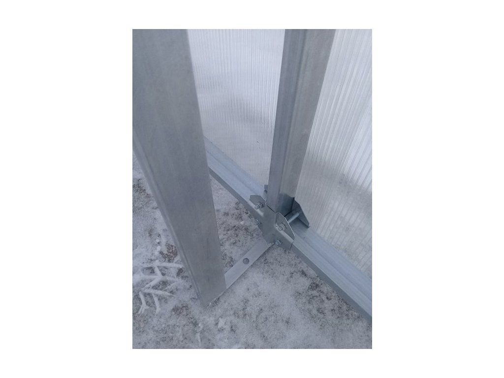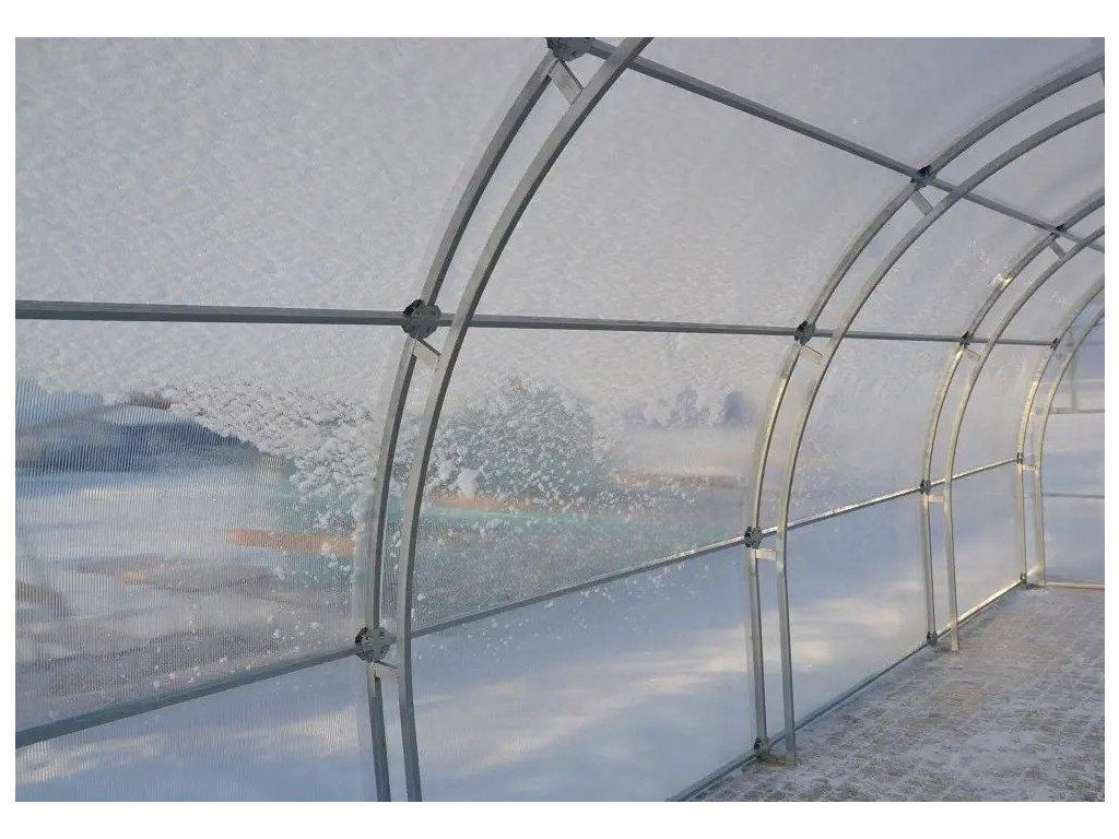 Zasklenie skleníka je tvorené čírym dutinkovým (komôrkovým) polykarbonátom s hrúbkou 4 mm s UV ochranou, vďaka ktorej nekrehne a nežltne. Polykarbonát je certifikovaný a spĺňa všetky podmienky zdravotnej nezávadnosti.