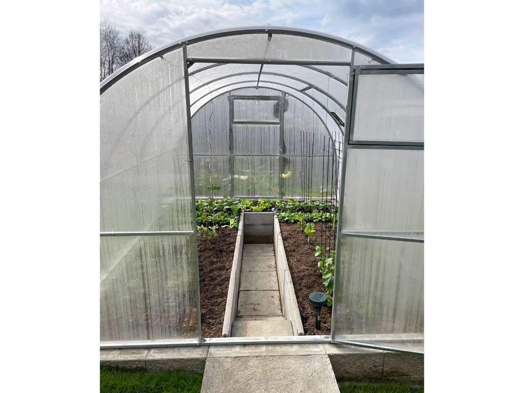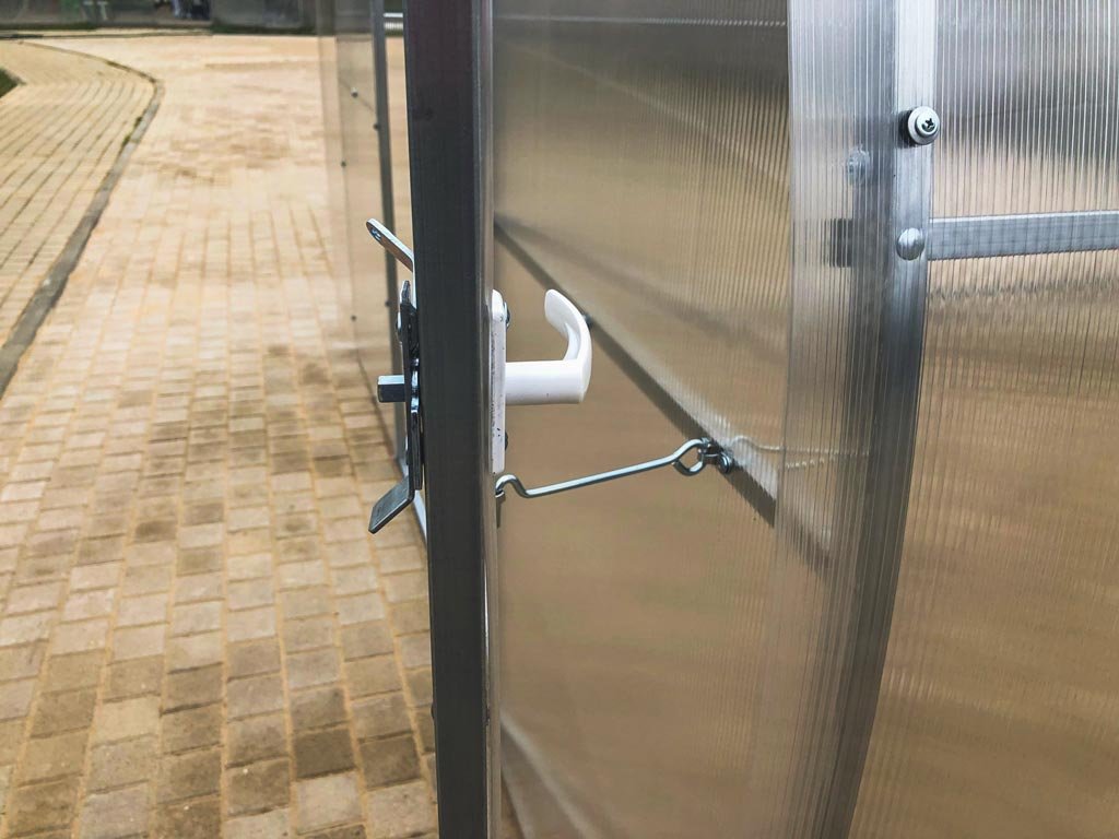 Zasklenie skleníka je tvorené čírym dutinkovým (komôrkovým) polykarbonátom s hrúbkou 4 mm s UV ochranou, vďaka ktorej nekrehne a nežltne. Polykarbonát je certifikovaný a spĺňa všetky podmienky zdravotnej nezávadnosti.