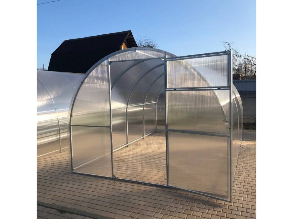 Zasklenie skleníka je tvorené čírym dutinkovým (komôrkovým) polykarbonátom s hrúbkou 4 mm s UV ochranou, vďaka ktorej nekrehne a nežltne. Polykarbonát je certifikovaný a spĺňa všetky podmienky zdravotnej nezávadnosti.