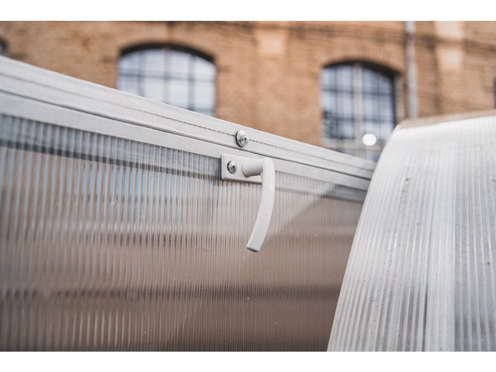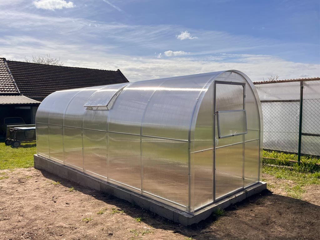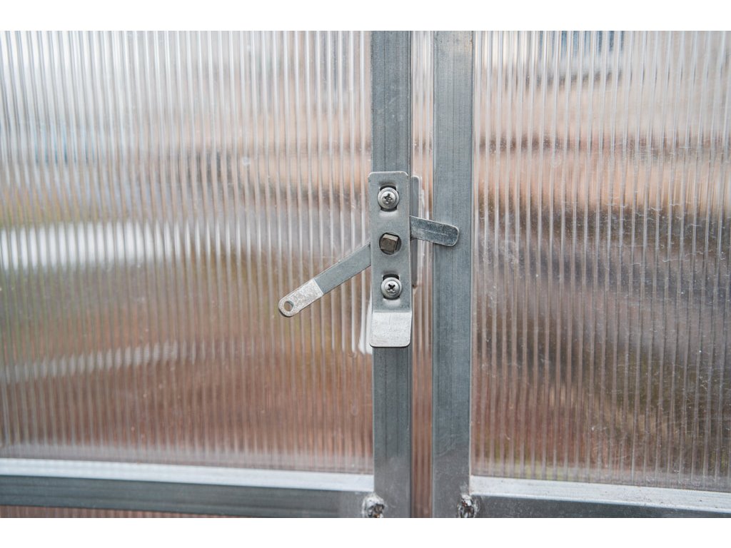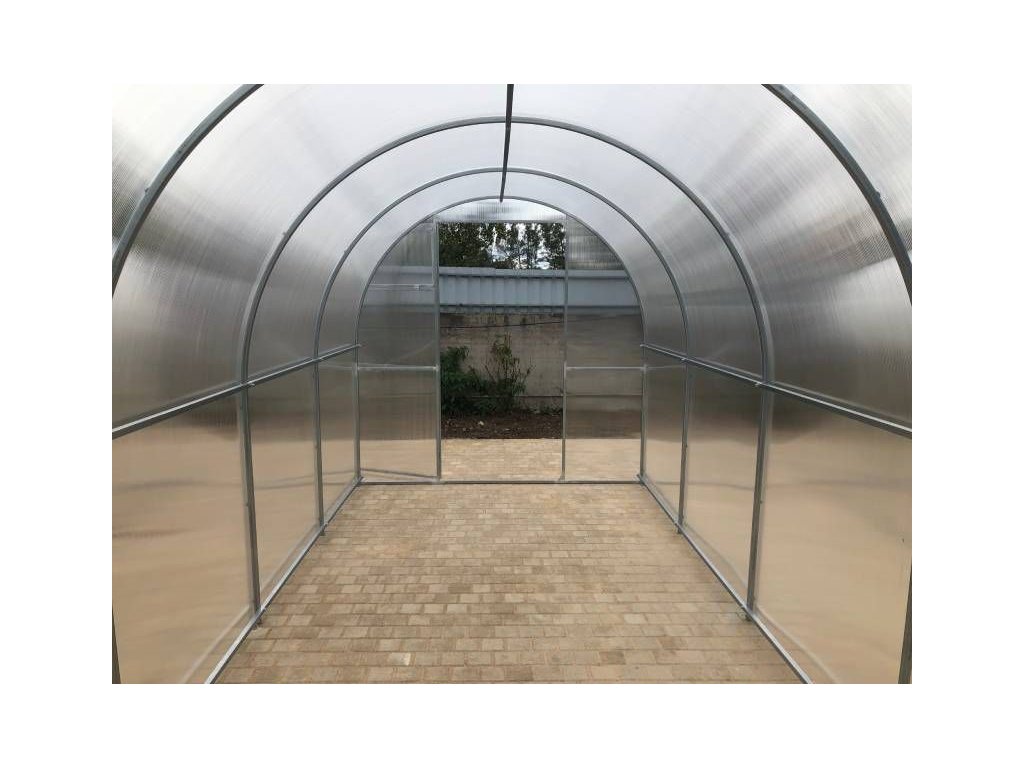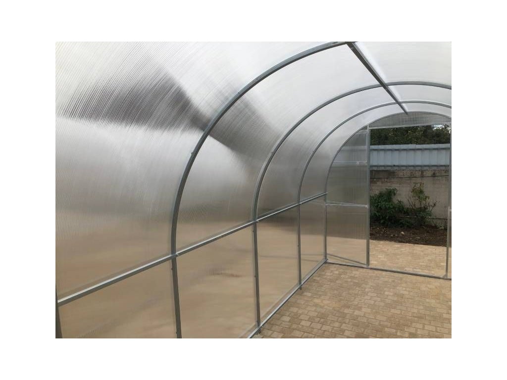 Zasklenie skleníka je tvorené čírym dutinkovým (komôrkovým) polykarbonátom s hrúbkou 6 mm s UV ochranou, vďaka ktorej nekrehne a nežltne. Polykarbonát je certifikovaný a spĺňa všetky podmienky zdravotnej nezávadnosti.