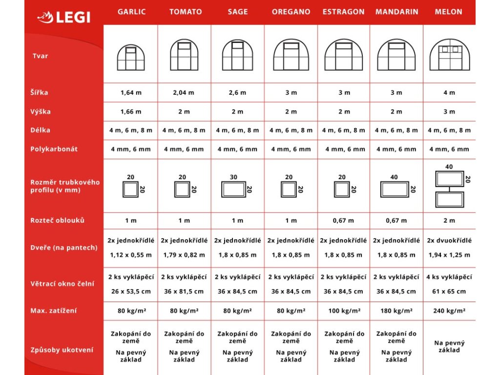 - Ponuku skleníkov LEGI s joklovou pozinkovanou konštrukciou, vrátane obľúbených skleníkov OREGANO, ESTRAGON, TOMATO a ďalších