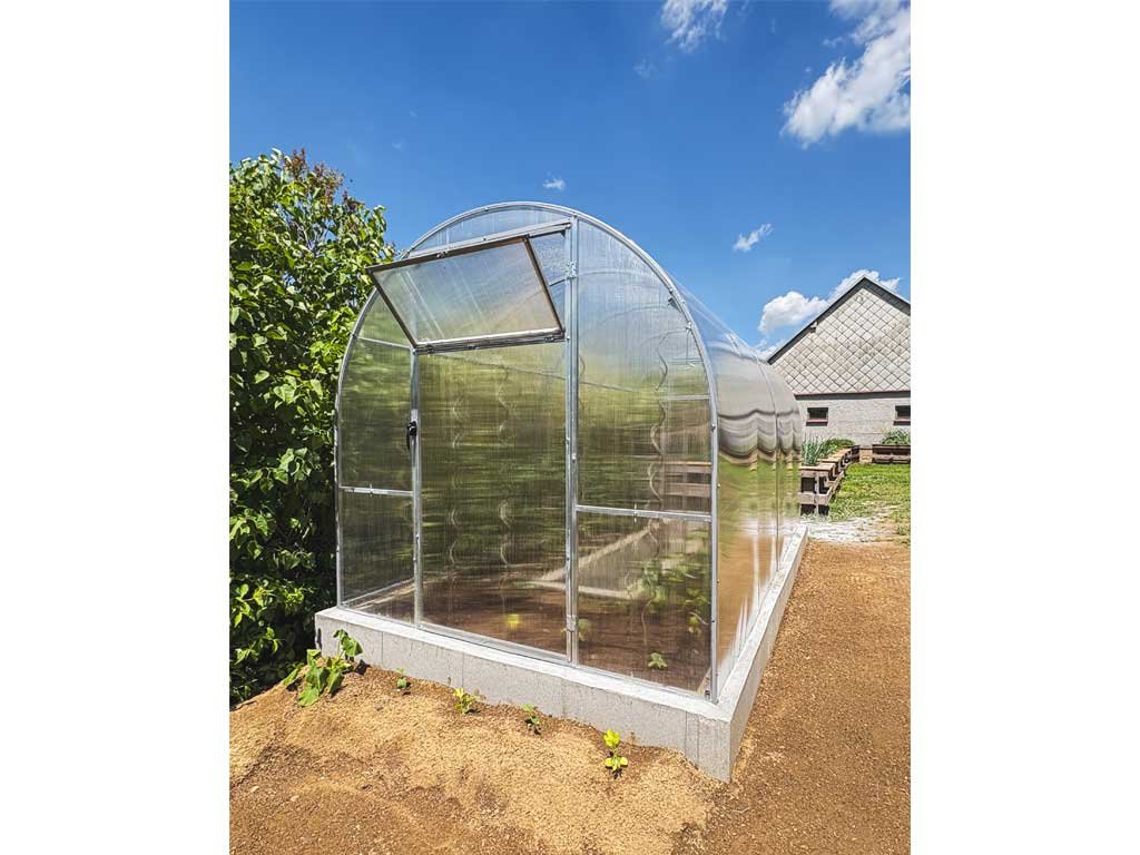 Zasklenie skleníka je tvorené čírym dutinkovým (komôrkovým) polykarbonátom s hrúbkou 4 mm s UV ochranou, vďaka ktorej nekrehne a nežltne. Polykarbonát je certifikovaný a spĺňa všetky podmienky zdravotnej nezávadnosti.