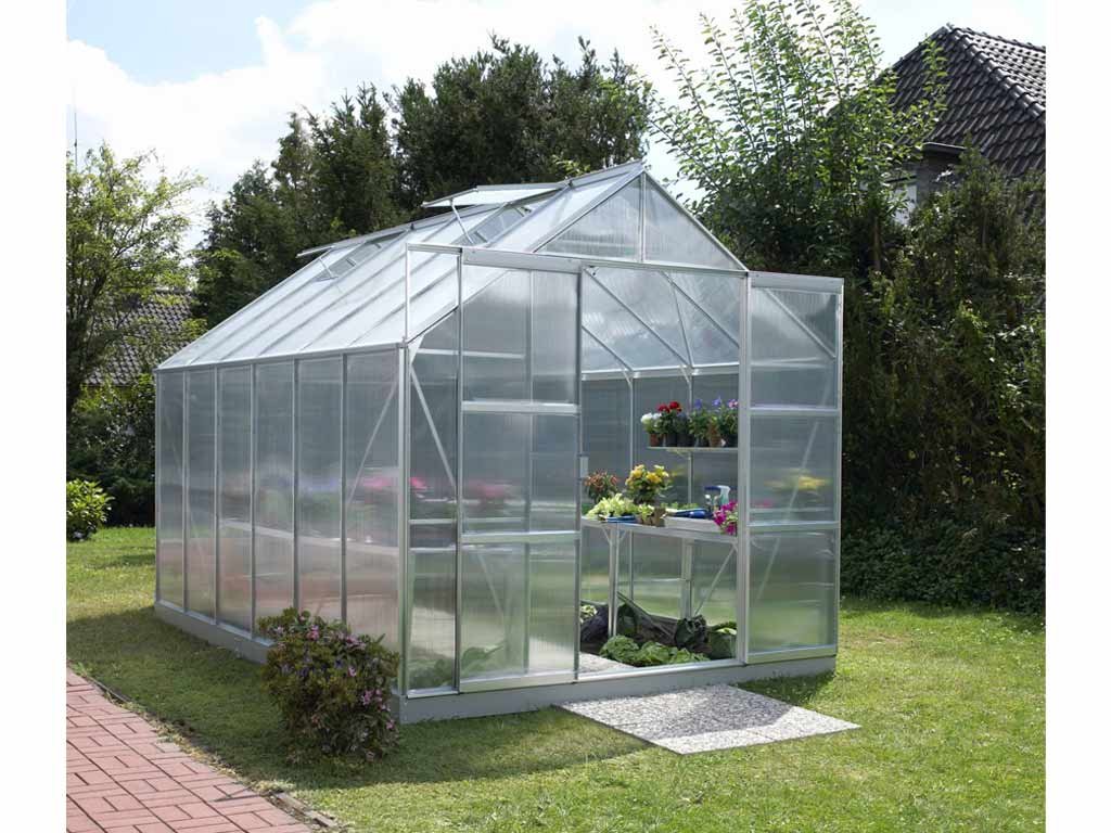 Polykarbonátový skleník VITAVIA URANUS 9900, PC 6 mm, strieborný + základňa VITAVIA URANUS 9900 sivá