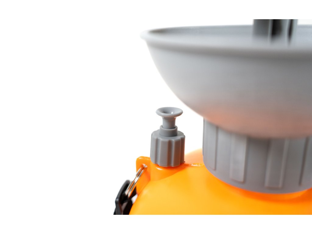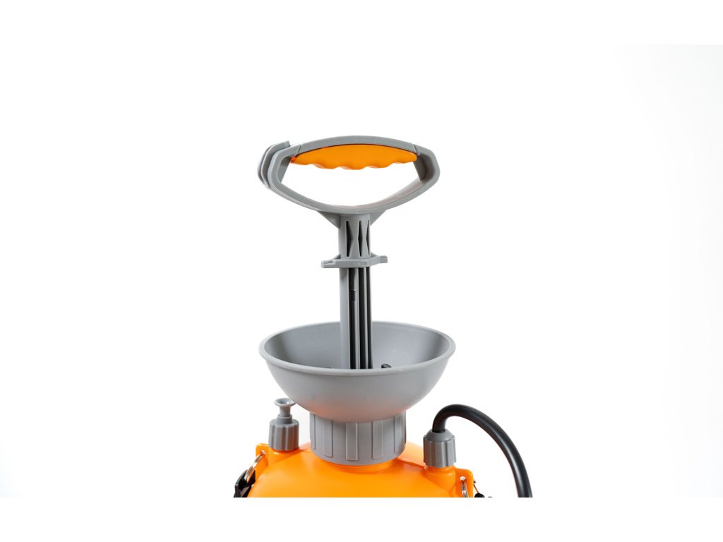 Tlakový postrekovač pracuje s maximálnym tlakom 4 bary. Kontrolu hladiny 8-litrovej nádrže vidíte na bočnej mierke. Kužeľová