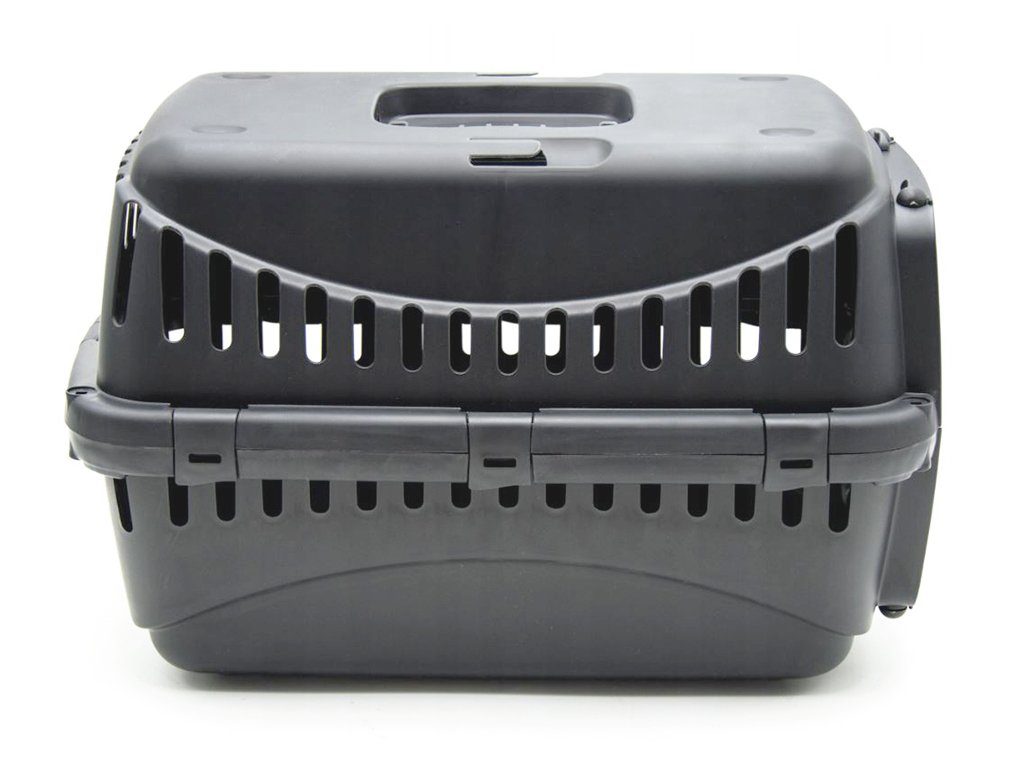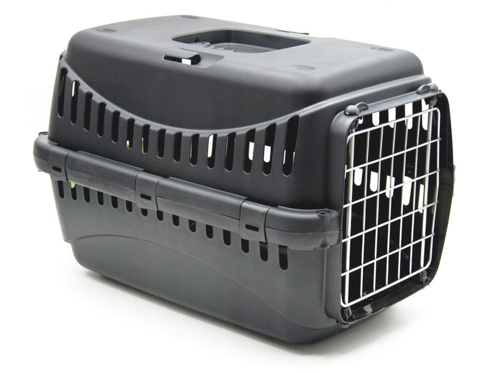 Pre psy a mačky do 6 kg, veko a dno sa spájajú klipsami, kovové predné dvierka, rukoväť na prenášanie, dva úchyty na bezpečnostný pás v aute, rozmery 45 × 30 × 30 cm.