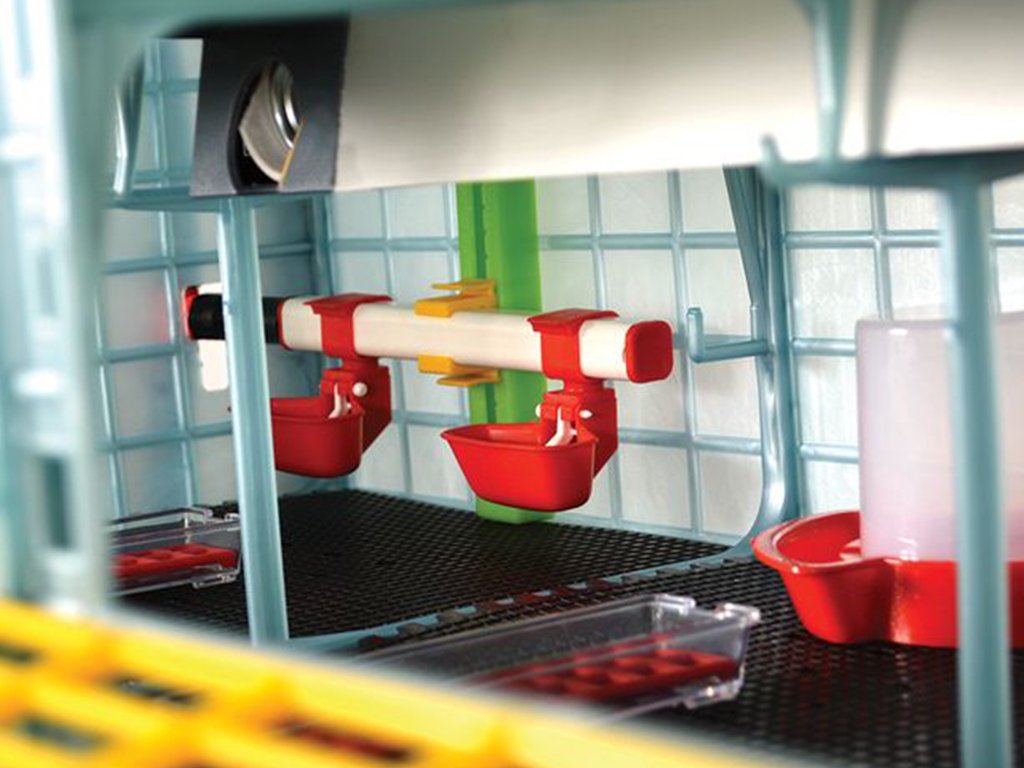 Odchovňa je vybavená dvoma klobúkovými napájačkami určenými na prvé dni života mláďat a dvoma výškovo nastaviteľnými niplovými napájačkami, ktoré zabezpečujú bezproblémové a hygienické napájanie mláďat vo vnútri klietky. Súčasťou niplových napájačiek sú aj prídavné misky na vodu, ktoré vytvárajú kvalitné automatické napájačky a zároveň bránia mláďatám v namáčaní sa. Voda do automatických napájačiek je privádzaná pomocou hadicového systému.