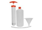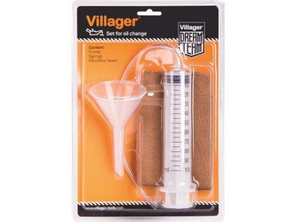 Súprava na výmenu oleja od značky VILLAGER obsahujúca lievik, 100 ml striekačku a handričku z mikrovlákna v rozmeroch 30 cm x 30 cm.