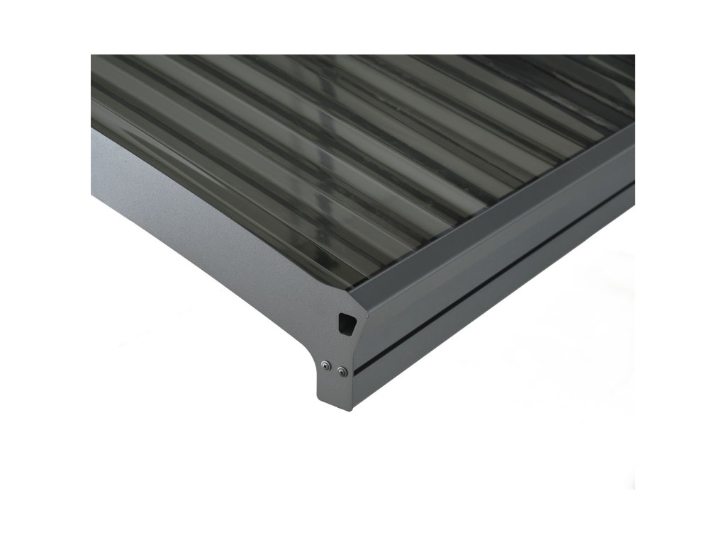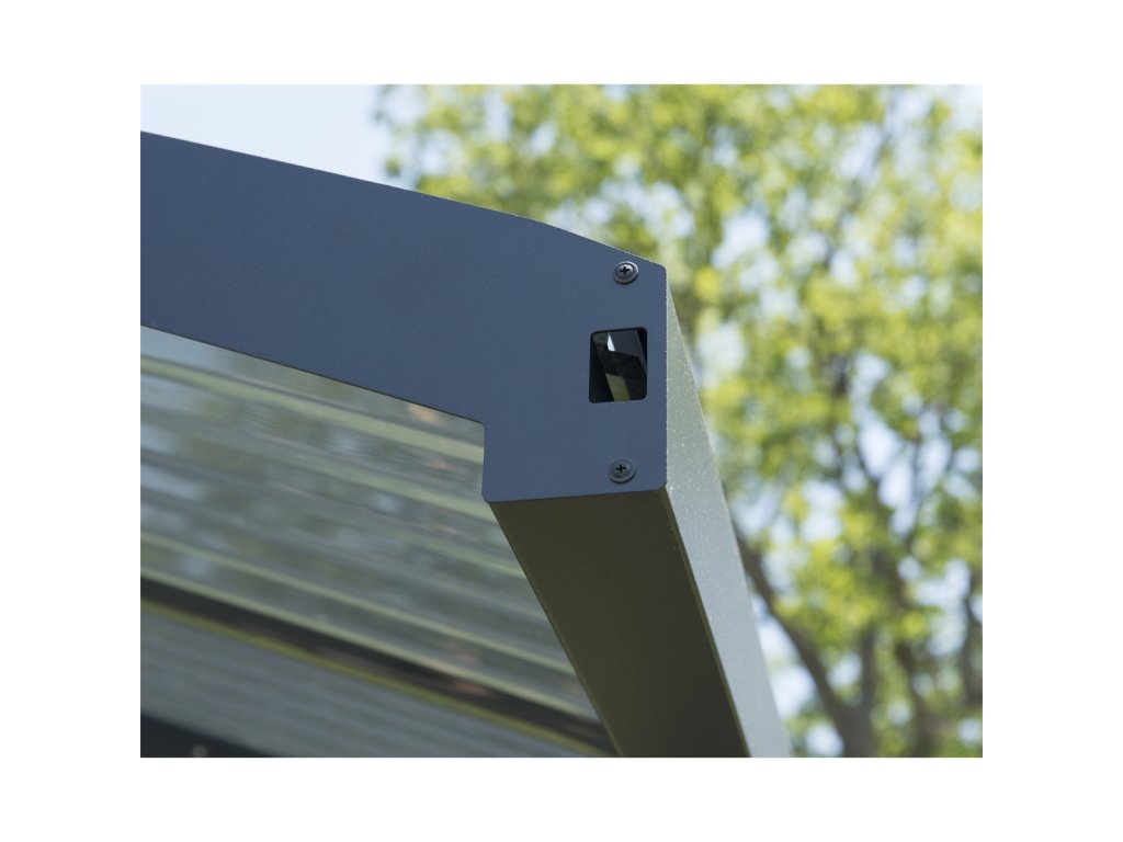 Prístrešok má pevný hliníkový rám, ktorý je doplnený galvanicky ošetrenými kovovými prvkami a povrchovo upravený práškovou farbou pre vysokú odolnosť voči korózii. Polykarbonátové střešní panely s UV ochranou sú navrhnuté tak, aby odolávali vysokému zaťaženiu, krúpam aj extrémnym poveternostným podmienkam. Celá konštrukcia je bezúdržbová a vysoko odolná voči všetkým vplyvom počasia.
