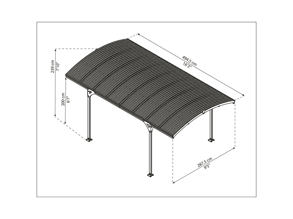 Rozmery prístrešku sú 494,5 x 287,5 x 239 cm (D x Š x V). Prístrešok má 4 oporné stĺpiky a je vybavený polykarbonátovým presklením Suntuf Solar, šedý, žlábkovaný profil, 10% propustnost světla, 100% UV ochrana. Rozmery balenia sú 296 x 75 x 15 cm. Prístrešok bude doručený prepravnou službou na palete, hmotnosť sa pohybuje okolo 160 kilogramov v závislosti od rozmerov altánu.