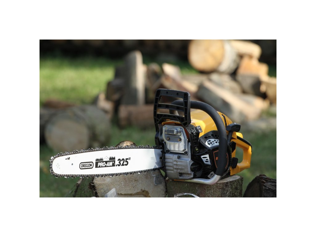 Lišta Oregon s dĺžkou 50 cm s kvalitnou reťazou umožňuje rezanie väčších kmeňov, prerezávanie lesného porastu, alebo prípravu palivového dreva na vykurovaciu sezónu. Reťaz sa napína jednoducho z boku stroja. Automatické olejové čerpadlo mazania reťaze ponúka možnosť nastavenia množstva oleja. Dôkladné mazanie reťaze znižuje trenie a zvyšuje životnosť reťaze. Píla je vybavená množstvom bezpečnostných prvkov, ako je účinná brzda reťaze a antivibračný systém AVS pre zaistenie maximálnej bezpečnosti obsluhy.