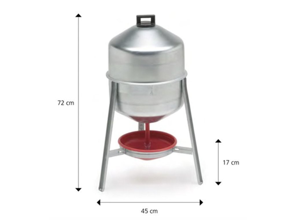 Rozmery napájačky sú Ø 450 × V 720 mm, s miskou vysokou 170 mm, čo ju robí dostatočne veľkou pre všetky druhy dospelej hydiny.