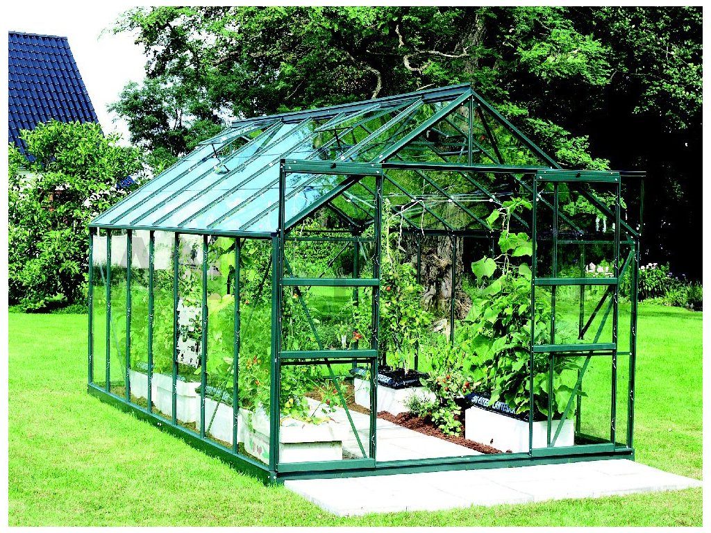 Skleník zo skla VITAVIA URANUS 11500, číre sklo 3 mm, zelený + základňa VITAVIA URANUS 11500 zelená